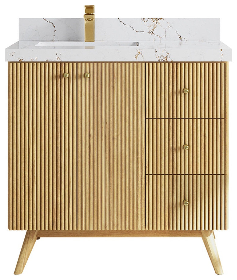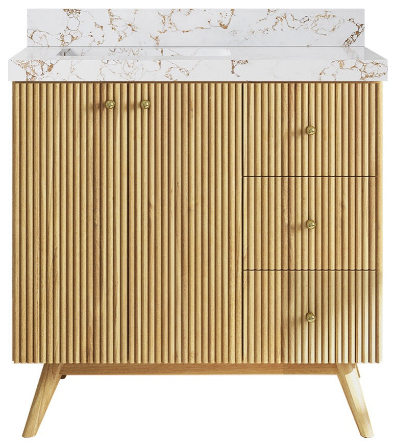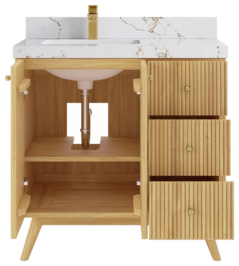 Willow Collection Pasadena 36 x 22 Left Offset Single Sink Bath Vanity in Light Natural Teak with 2" Straight/ Mitered Edge Viola GoldThe Pasadena collection open bathroom vanity is a stunning piece that will elevate the look of any modern bathroom. It is made of durable teak wood and features a reeded-fluted design with a touch of modernity. The textured wooden finish of the vanity perfectly complements any bathroom interior, while the open storage area adds a modern coastal touch. In addition to its stylish appearance, this vanity is also practical, with plenty of space to store all of your bathroom essentials. With its subtle yet eye-catching look, the Pasadena collection open bathroom vanity is a must-have for any bathroom renovation.The reeded design of this bathroom vanity adds a touch of sophistication and modernity to any bathroom.The soft close hardware ensures a smooth and quiet closure every time, adding a touch of luxury to the vanity.The natural teak wood construction is both durable and eco-friendly, making it a sustainable choice for any home.The vanity comes equipped with plenty of storage space, including brass hardware, to keep your bathroom essentials organized and out of sight.The premium thick quartz or marble countertops add a touch of elegance and durability to the vanity, making it a beautiful and practical addition to any modern or coastal-themed home.Details:Material: Teak WoodFinish Available: Light Natural TeakNumber of Drawers: 3 Regular Drawers, 1 ShelfSink Installation: Under-mounted rectangle SINK(S)Hardware Finish: GoldCabinet Width: 35 (in.)Cabinet Depth: 21-1/2 (in.)Countertop Width: 36 (in.) Countertop Depth: 22 (in.)Cabinet Height: 34 (in.)Countertop Height: 1.5 (in.) Double Cove Edge or 2 (in.) Straight/ Mitered EdgeCabinet Height with Top: 36 (in.)Backsplash Height: 4 (in.)Faucet: NOT IncludedFaucet Hole(S): Comes with SINGLE hole faucetVanity Countertops options: Mitered /Straight edge or Double Cove Edge (White Quartz, Calacatta Laza Quartz, Calacatta Nuvo Quartz, Carrara Quartz, Empira Quartz, Carrara Marble, Piatra Gray Quartz, Pearl Light Gray Quartz, Venatino Quartz, Calacatta Gold Quartz, Calacatta Black Quartz, Calacatta Nuvo Quartz)