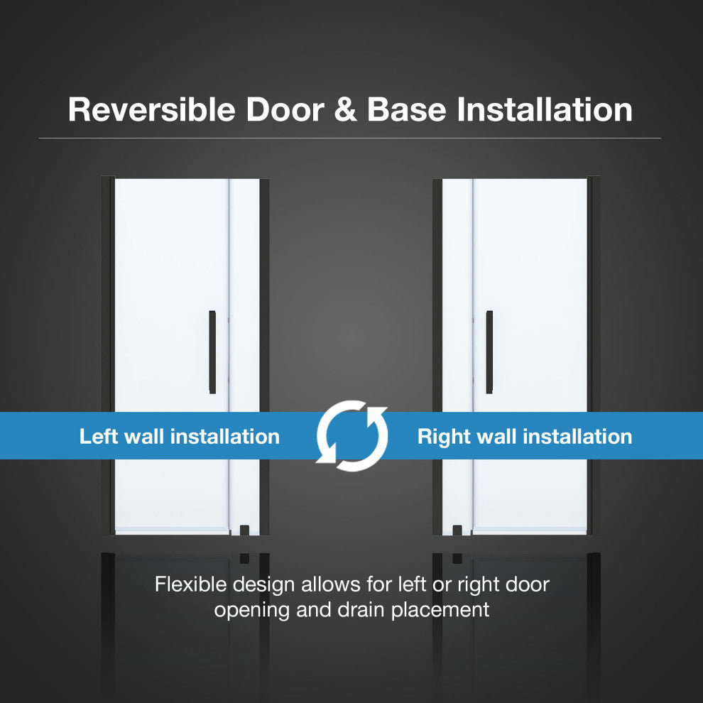 The OVE Decors Pasadena frameless pivot shower door kit offers the kind of sophisticated enclosure design that complements any and all bathroom styles. It has a full-length door-to-wall pivot door mechanism, with premium quality hardware in a matte black finish, and includes a 25 in. wide door panel, a 6 in. wide inline panel and a 36 in. x 36 in. x 2 3/4 in. shower base, ideal for an alcove installation. All glass door panels are made from premium 8mm (5/16) thick certified tempered glass and feature high quality magnetic door strips and engineered hardware that ensure smooth opening and closing and no leaks. The reversible shower pan has a subtle covered side drain design, is made of premium fiberglass-reinforced acrylic and has a slip-minimizing textured surface and easy-to-clean construction.