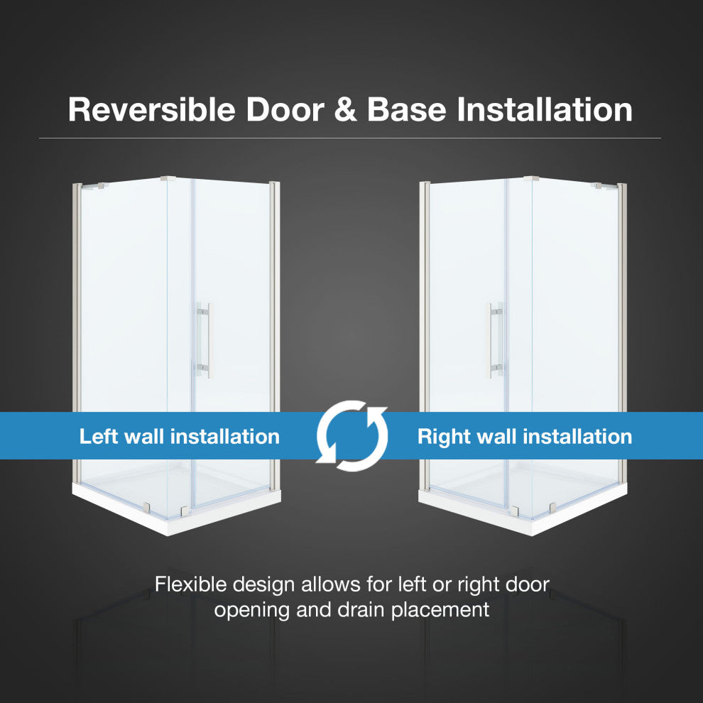 The OVE Decors Pasadena frameless pivot shower door kit offers the kind of sophisticated enclosure design that complements any and all bathroom styles. It has a full-length door-to-wall pivot door mechanism, with premium quality hardware in a satin nickel finish, and includes a 25 in. wide door panel, a 6 in. wide inline panel, a 33 in. wide side panel, and a 36 in. x 36 in. x 2 3/4 in. shower base, ideal for a corner installation. All glass door panels are made from premium 8mm (5/16) thick certified tempered glass and feature high quality magnetic door strips and engineered hardware that ensure smooth opening and closing and no leaks. The reversible shower pan has a subtle covered side drain design, is made of premium fiberglass-reinforced acrylic and has a slip-minimizing textured surface and easy-to-clean construction.