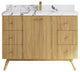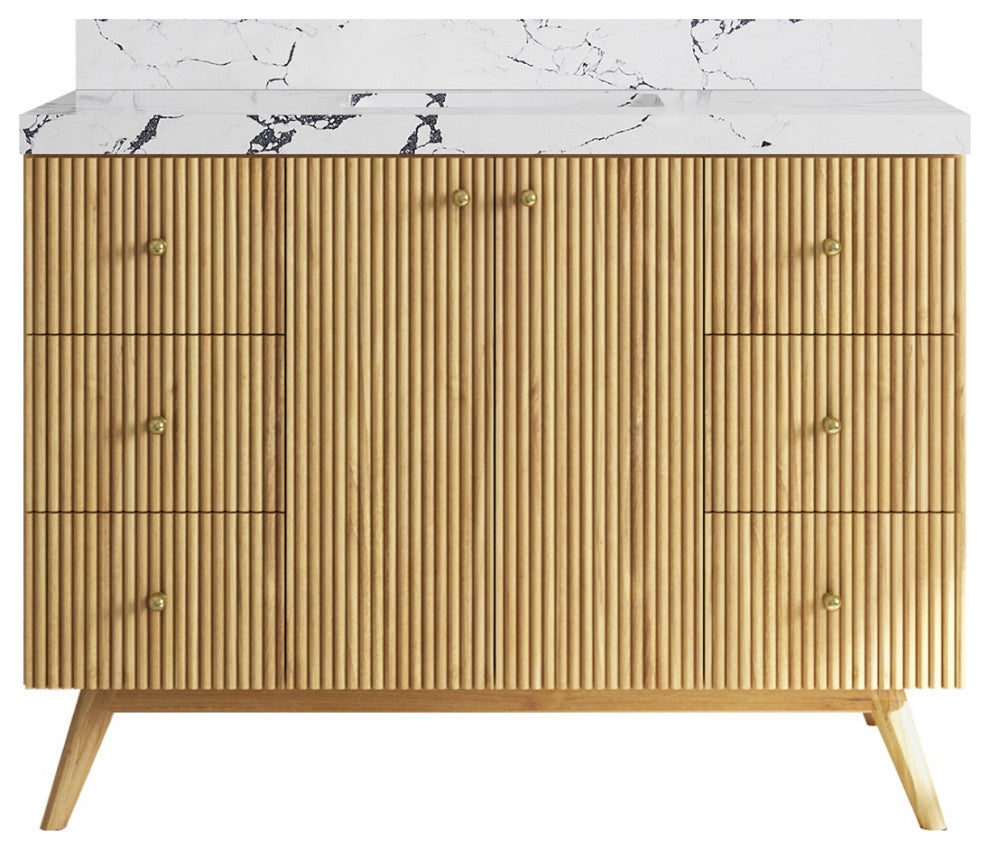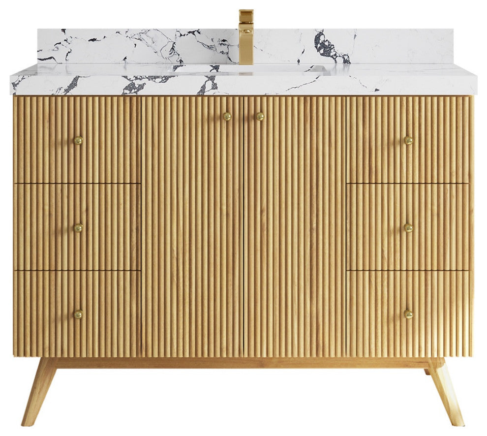 Willow Collection Pasadena 48 x 22 Single Sink Bath Vanity in Light Natural Teak with 2" Straight/ Mitered Edge Viola NightThe Pasadena collection open bathroom vanity is a stunning piece that will elevate the look of any modern bathroom. It is made of durable teak wood and features a reeded-fluted design with a touch of modernity. The textured wooden finish of the vanity perfectly complements any bathroom interior, while the open storage area adds a modern coastal touch. In addition to its stylish appearance, this vanity is also practical, with plenty of space to store all of your bathroom essentials. With its subtle yet eye-catching look, the Pasadena collection open bathroom vanity is a must-have for any bathroom renovation.The reeded design of this bathroom vanity adds a touch of sophistication and modernity to any bathroom.The soft close hardware ensures a smooth and quiet closure every time, adding a touch of luxury to the vanity.The natural teak wood construction is both durable and eco-friendly, making it a sustainable choice for any home.The vanity comes equipped with plenty of storage space, including brass hardware, to keep your bathroom essentials organized and out of sight.The premium thick quartz or marble countertops add a touch of elegance and durability to the vanity, making it a beautiful and practical addition to any modern or coastal-themed home.Details:Material: Teak WoodFinish Available: Light Natural TeakNumber of Drawers: 6 Regular Drawers, 1 ShelfSink Installation: Under-mounted rectangle SINK(S)Hardware Finish: GoldCabinet Width: 47 (in.)Cabinet Depth: 21-1/2 (in.)Countertop Width: 48 (in.) Countertop Depth: 22 (in.)Cabinet Height: 34 (in.)Countertop Height: 1.5 (in.) Double Cove Edge or 2 (in.) Straight/ Mitered EdgeCabinet Height with Top: 36 (in.)Backsplash Height: 4 (in.)Faucet: NOT IncludedFaucet Hole(S): Comes with SINGLE hole faucetVanity Countertops options: Mitered /Straight edge or Double Cove Edge (White Quartz, Calacatta Laza Quartz, Calacatta Nuvo Quartz, Carrara Quartz, Empira Quartz, Carrara Marble, Piatra Gray Quartz, Pearl Light Gray Quartz, Venatino Quartz, Calacatta Gold Quartz, Calacatta Black Quartz, Calacatta Nuvo Quartz)