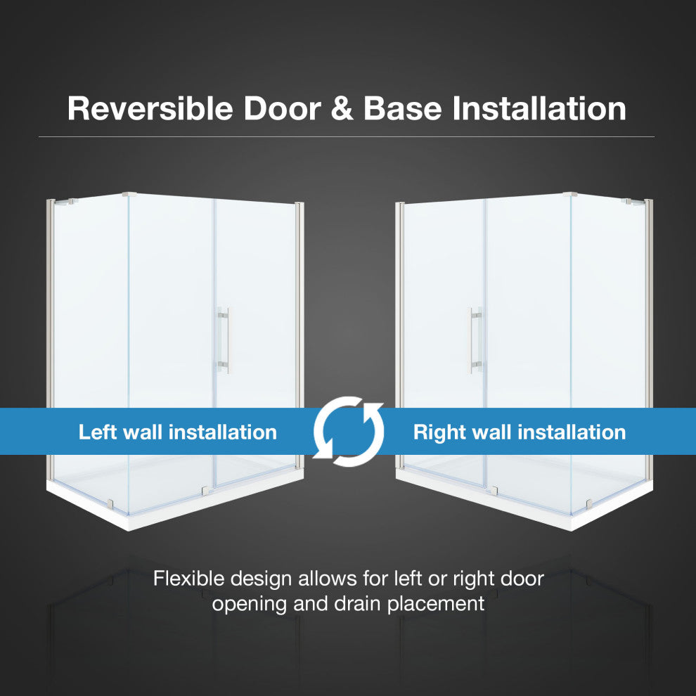 The OVE Decors Pasadena 60 in. frameless pivot shower door kit offers the kind of sophisticated enclosure design that complements any and all bathroom styles. It has a full-length door-to-wall pivot door mechanism, with premium quality hardware in a satin nickel finish, and includes a 25 in. wide door panel, a 29 in. wide inline panel, a 33 in. wide side panel, and a 60 in. x 36 in. x 2 3/4 in. shower base, ideal for a corner installation. All glass door panels are made from premium 8mm (5/16) thick certified tempered glass and feature high quality magnetic door strips and engineered hardware that ensure smooth opening and closing and no leaks. The reversible shower pan has a subtle covered side drain design, is made of premium fiberglass-reinforced acrylic and has a slip-minimizing textured surface and easy-to-clean construction.