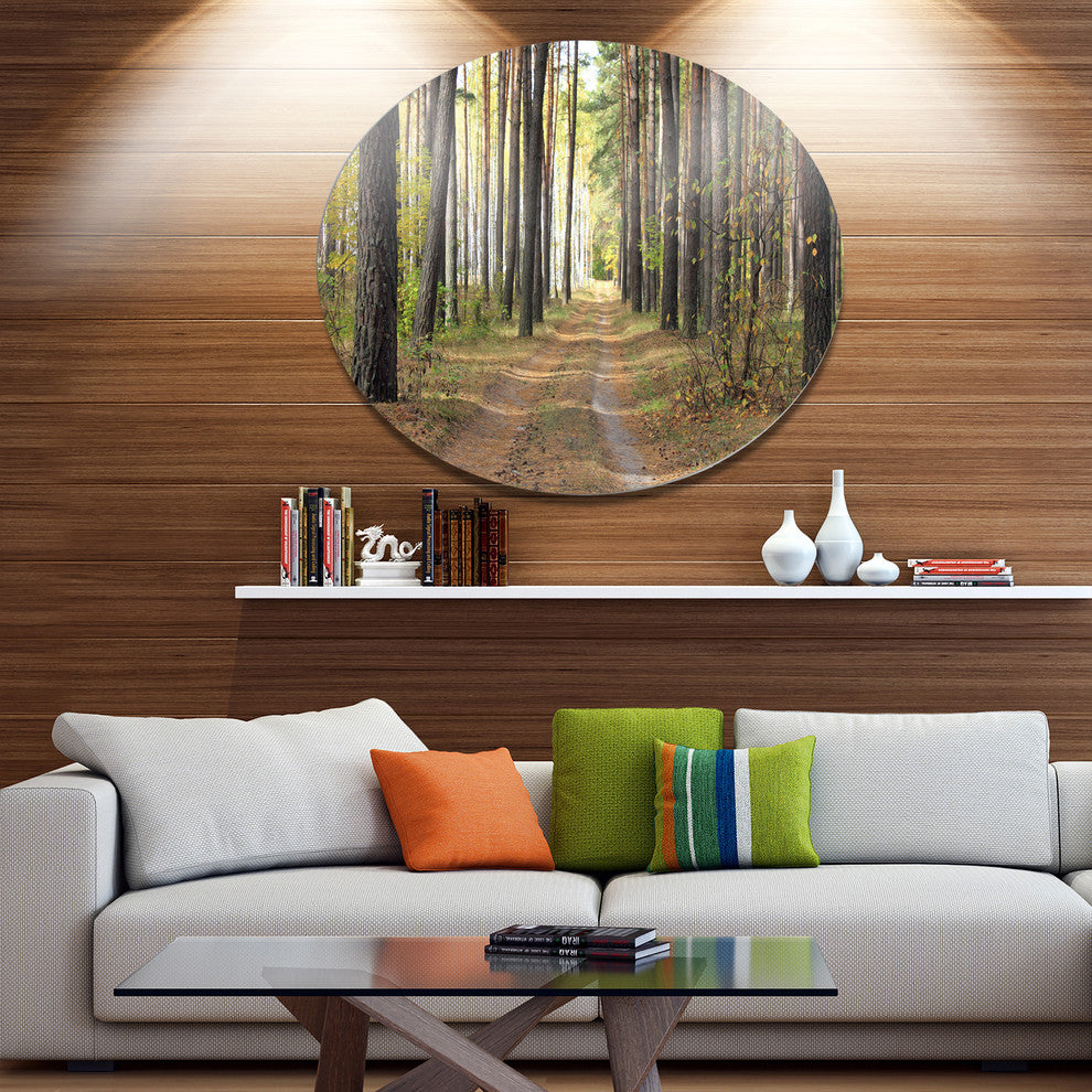 Pathway In Autumn Pine Forest, Modern Forest Round Metal Wall Art, 23"