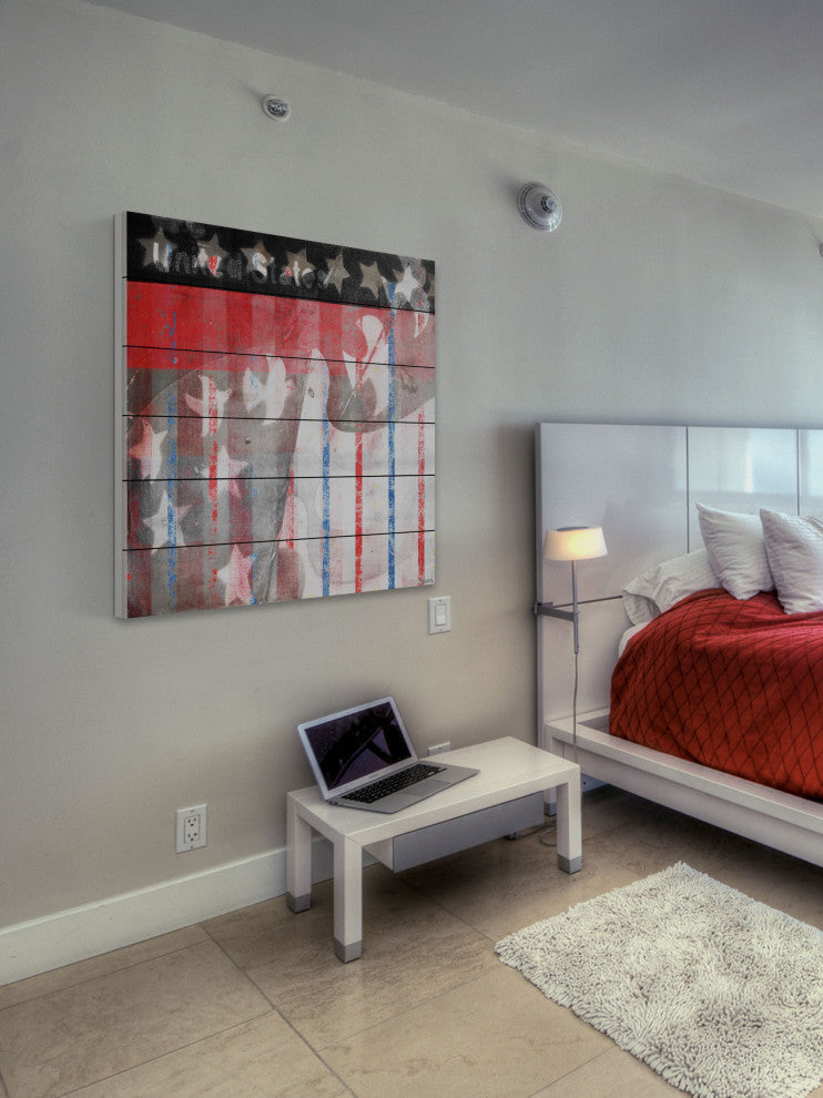 Striking and unique, the "Patriotic Birds" Print on White Wood by Parvez Taj will bring your walls to life. Printed on white wood, this 32 inch wide by 32 inch tall contemporary artwork will make a statement in any living room, dining room, or bedroom.- Fine art UV ink print on white wood by Parvez Taj- wood pieces are hand-selected by Fine craftsmen for printing- Arrives ready to hang- Includes a certificate of authenticity- Artist signature on the front