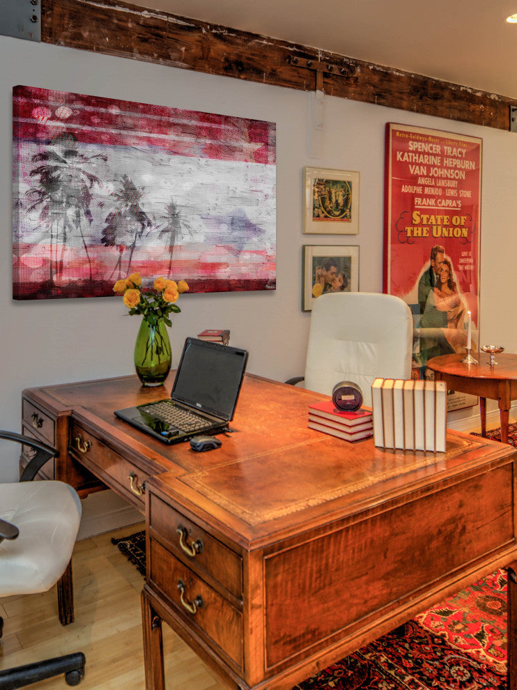 Striking and unique, the "Patriotic Palms" Print on Canvas by Parvez Taj will bring your walls to life. Printed on canvas, this 24 inch wide by 16 inch tall contemporary artwork will make a statement in any living room, dining room, or bedroom.- Fine art canvas print by Parvez Taj- Professionally hand stretched- Gallery wrapped in sustainable, non-warping wood- Arrives ready to hang- Made in the USA- Includes a certificate of authenticity- Artist signature on the front
