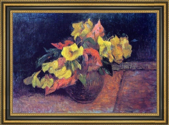16" x 24" Paul Gauguin Evening Primroses in a Vase framed premium canvas print reproduced to meet museum quality standards. Our Museum quality canvas prints are produced using high-precision print technology for a more accurate reproduction printed on high quality canvas with fade-resistant, archival inks. Our progressive business model allows us to offer works of art to you at the best wholesale pricing, significantly less than art gallery prices, affordable to all. This artwork is hand stretched onto wooden stretcher bars, then mounted into our 3 3/4" wide gold finish frame with black panel by one of our expert framers. Our framed canvas print comes with hardware, ready to hang on your wall. We present a comprehensive collection of exceptional canvas art reproductions by Paul Gauguin .