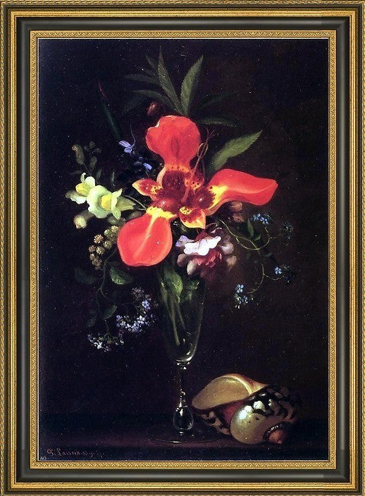 18" x 27" Paul Lacroix Vase of Flowers and a Shell framed premium canvas print reproduced to meet museum quality standards. Our Museum quality canvas prints are produced using high-precision print technology for a more accurate reproduction printed on high quality canvas with fade-resistant, archival inks. Our progressive business model allows us to offer works of art to you at the best wholesale pricing, significantly less than art gallery prices, affordable to all. This artwork is hand stretched onto wooden stretcher bars, then mounted into our 3 3/4" wide gold finish frame with black panel by one of our expert framers. Our framed canvas print comes with hardware, ready to hang on your wall. We present a comprehensive collection of exceptional canvas art reproductions by Paul Lacroix.