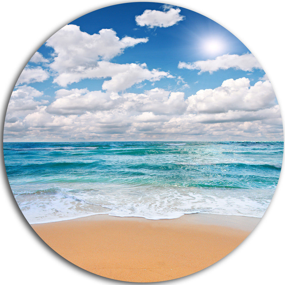 Bring Contemporary Abstraction to your home with this large Circle Metal wall art. This Peaceful Seashore under White Clouds Metal Artwork makes it the focal point of any room or office.