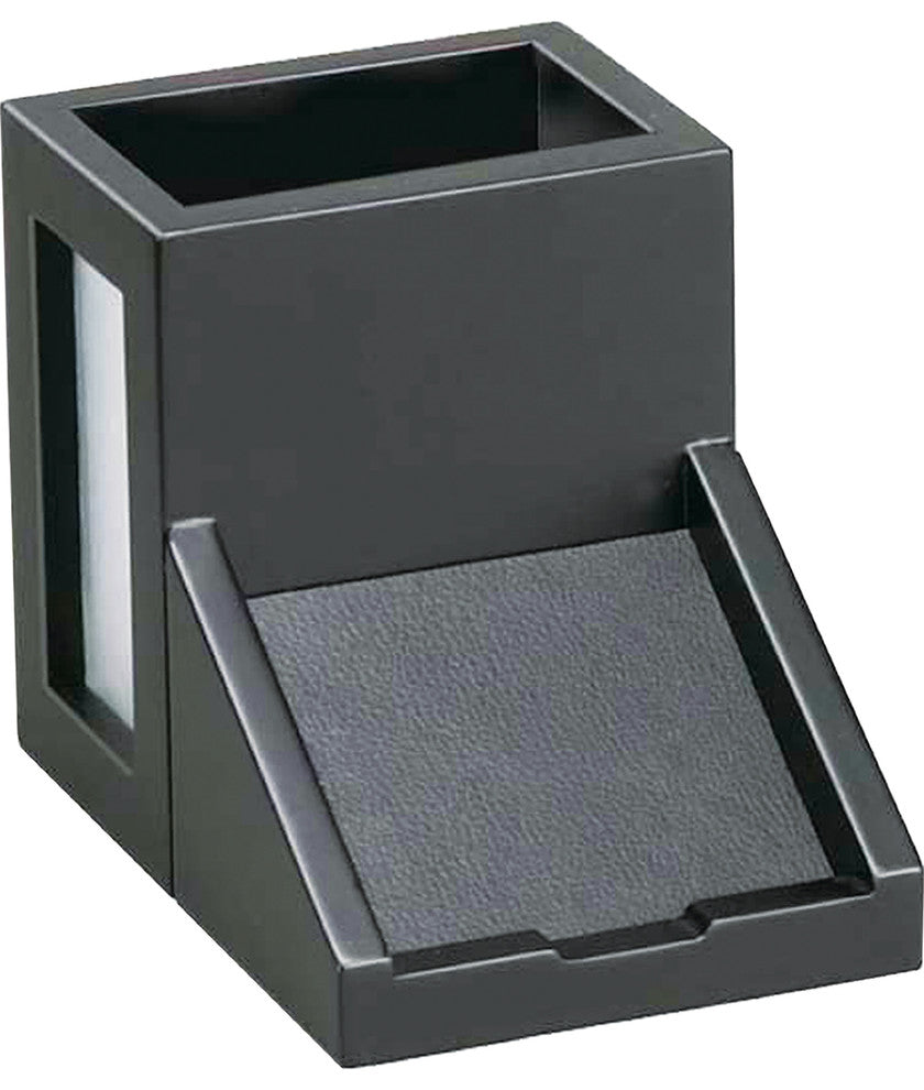 The 9505-5 Pencil Cup with Note Holder provides a large pencil cup for storing writing utensils, and an angled note compartment for easy writing and viewing. Features sturdy wood construction with a durable double coated matte black finish. Frosted glass windows add a touch of class. Non-slip rubber feet reduce movement and protect your work surface from scratches and scuffs. Convenient 5.6 x 3.9 x 4.4 design combines pens and a note pad in one location. Perfect for use either at home or in the office. 90 day manufacturer warranty.