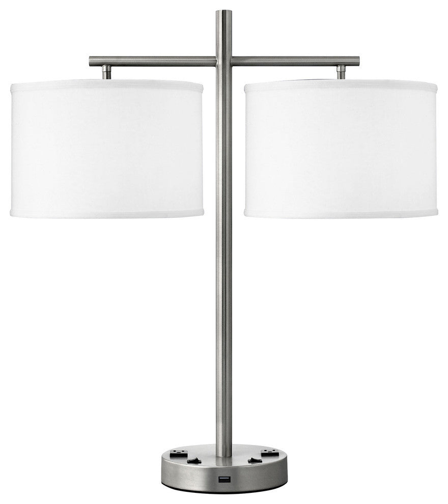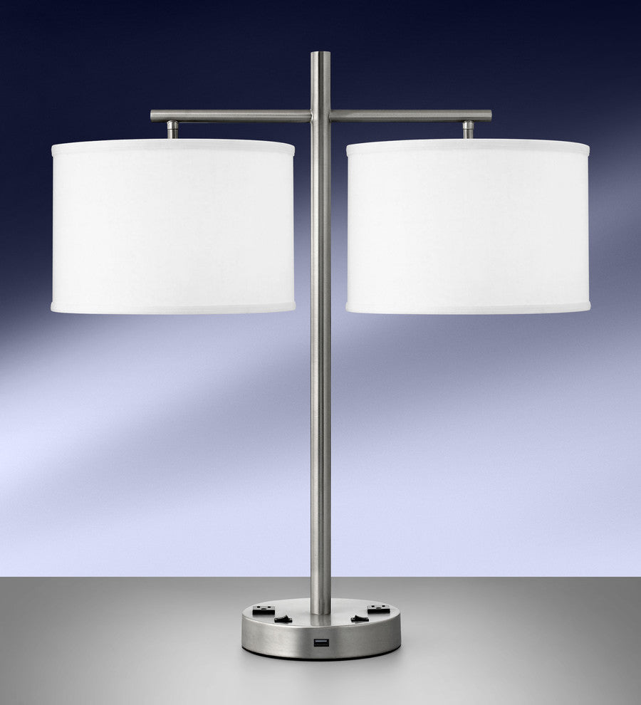 Standard Lamp Specifications for #UWL2806:Product Type: Twin-light Double Nightstand LampHeight: 26"Finish: Brushed SteelConstruction: SteelSocket: (2) Aluminum On/Off Med. Base Type A 100W Max socket(s). (Bulb not included)Switching: (2) On/Off Rocker switch(es) located on the base.Cord: 6''5'' (from base) long black 16 gauge cord set with a 3 prong grounded plug.Electrical Outlet: (2) 3 prong grounded outlet(s).Data Port: None.USB Port: (1) 10W/2A USB port(s).UL/CUL and/or ETL listed: YesStandard Packing: 2 per carton (shade packed separately).Lamps & Shades per SKU: 2Lamping: (2) Aluminum On/Off Med. Base Type A 100W Max socket(s).Shade Size and Description: White fabric laminated to styrene hardback drum with self fold trim measuring 10" x 10" x 7.5" w/ .5" drop (Top x Bottom x Slant).Bulb Included: NoMaterial Description: constructed from polished, plated, and lacquered steel.