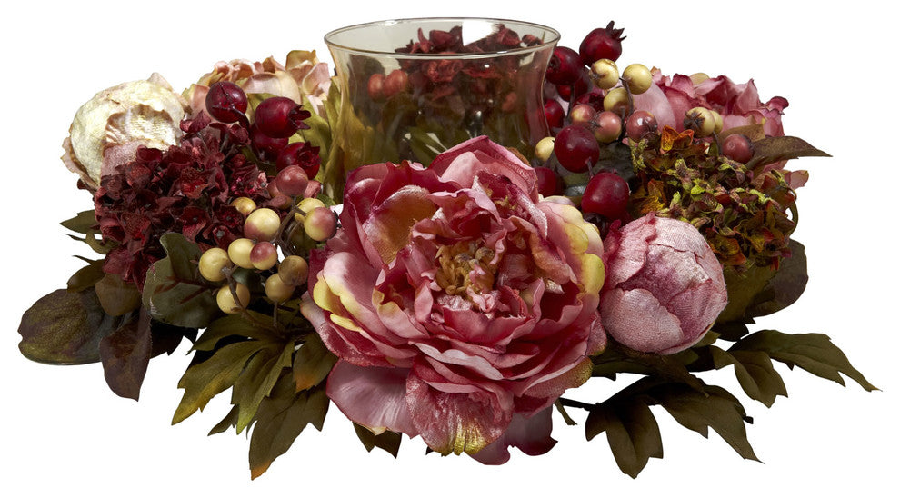 A candle makes any table or shelf a little warmer in feel. And surrounding that candle with a beautiful circle of Peony makes it doubly so. The soft colors, lush berries, and green leaves will create a heartwarming scene as they dance in candlelight. Comes with a fluted glass center for your candle, this is perfect for your holiday table, and also makes an ideal gift.