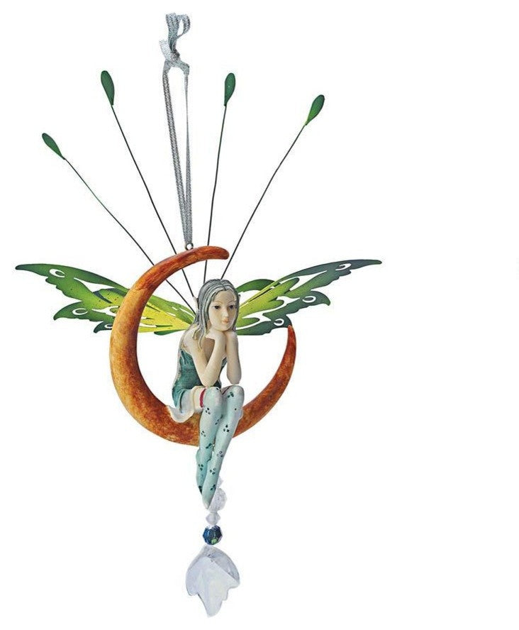 Perched atop her crescent moon with a trail of sparkling moonstones at her feet, our collectible fairy statue is ready to attract attention while dangling prettily by a metallic-toned ribbon from a window, bookshelf or holiday tree! Cast in quality designer resin, this unique fairy sculpture boasts graceful metal wings. Based on the fabled fairies of Lochloy House and created exclusively for, our fairy figurine is hand-painted in magical hues. Each: 4.5"W x 4"D x 8"H. 1 lb.