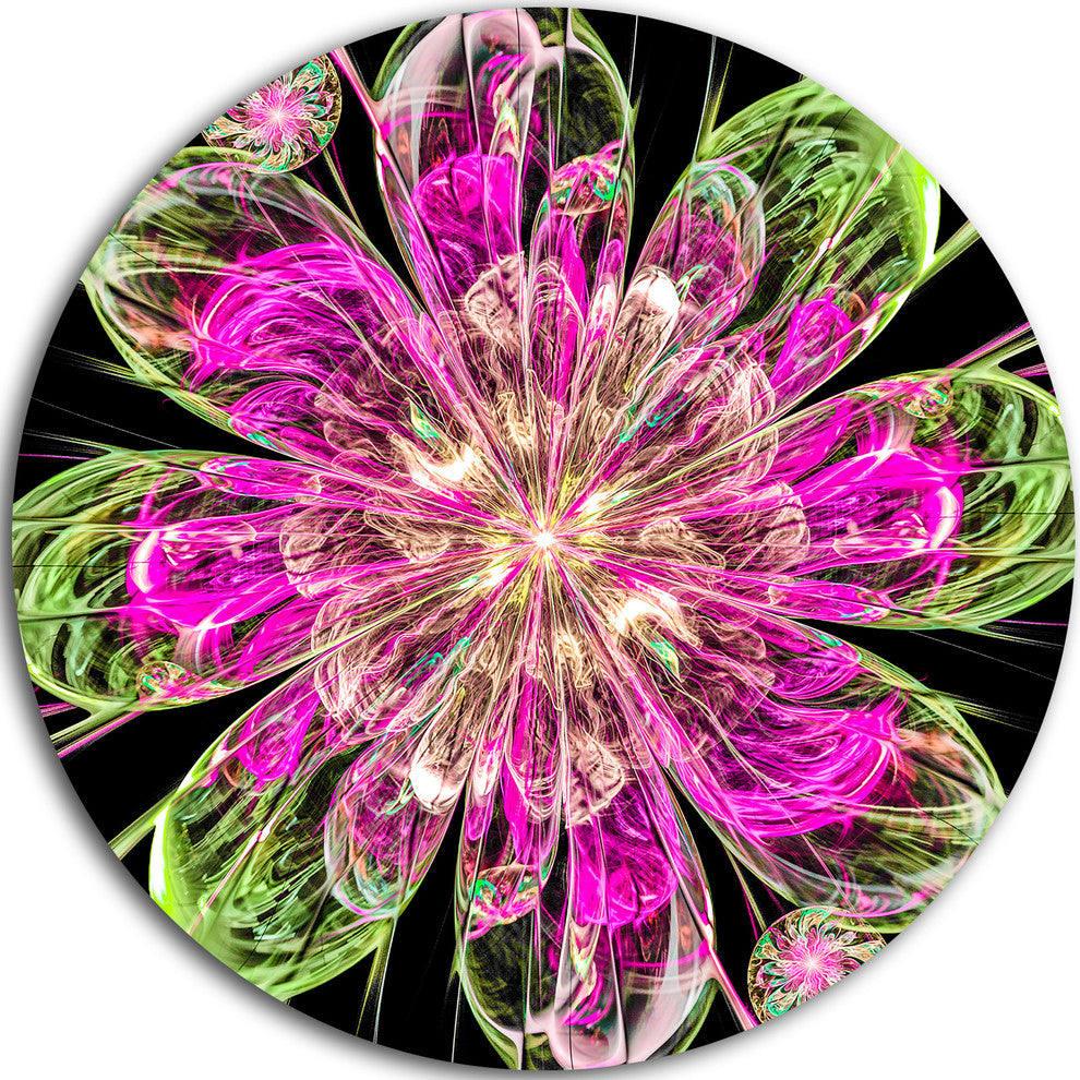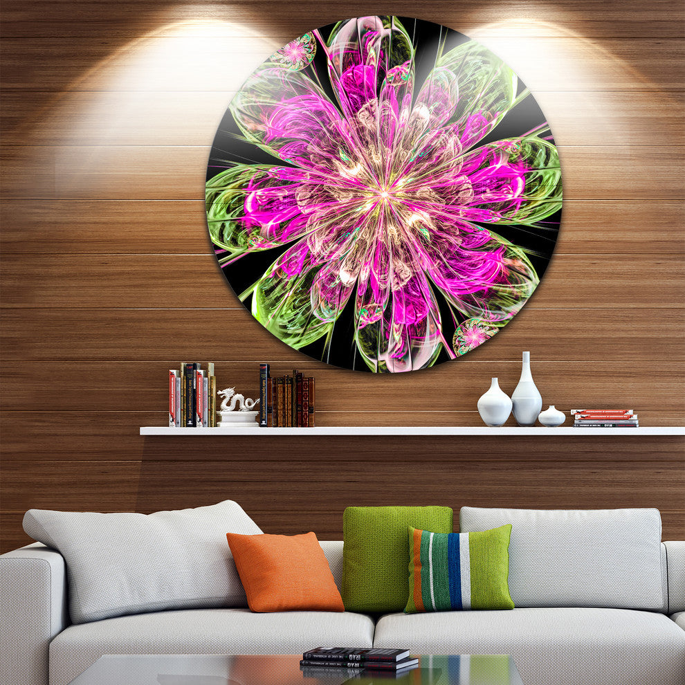 Bring Contemporary Abstraction to your home with this large Circle Metal wall art. This Perfect Fractal Flower in Pink and Green Metal Artwork makes it the focal point of any room or office.
