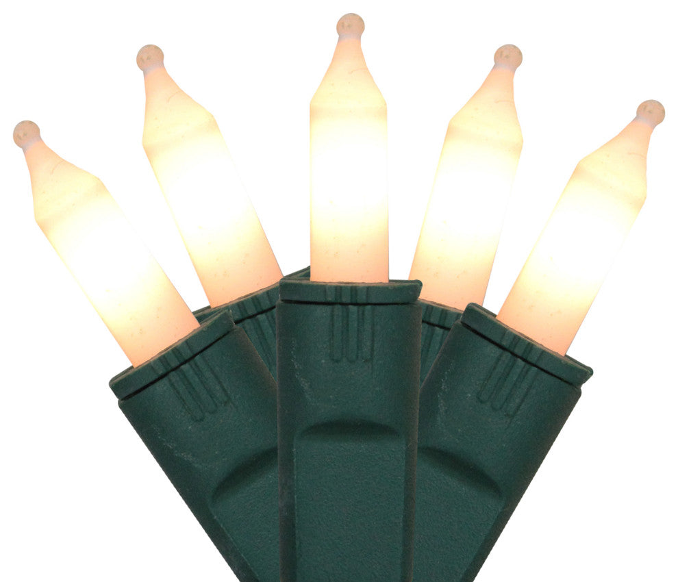 Create a winter scene in your home any time of the year using these lights. Hang them from the roof or across the fence to create a shimmering display of light inside or out. These lights will turn your home into a wonderland this season! Features: Color: clear frosted bulbs / green wire Number of bulbs on string: 50 Bulb size: mini Spacing between each bulb: 6" Lighted length: 24.75'' Total length: 25.25'' 3" lead cord 3" tail cord Additional product features: Super bright bulbs Trouble free Perm-O-Snap lights feature a patented internal design that ensures wire contact and provides extra security against bad weather and vandals If one bulb burns out the rest will stay lit Wire gauge: 22 Contains end-to-end connectors which allows you to connect multiple sets together (not to exceed 210 watts) Comes with replacement bulbs and spare fuses UL certified and approved for indoor or outdoor use 120 volts 60 hertz .2 amps 24 watts