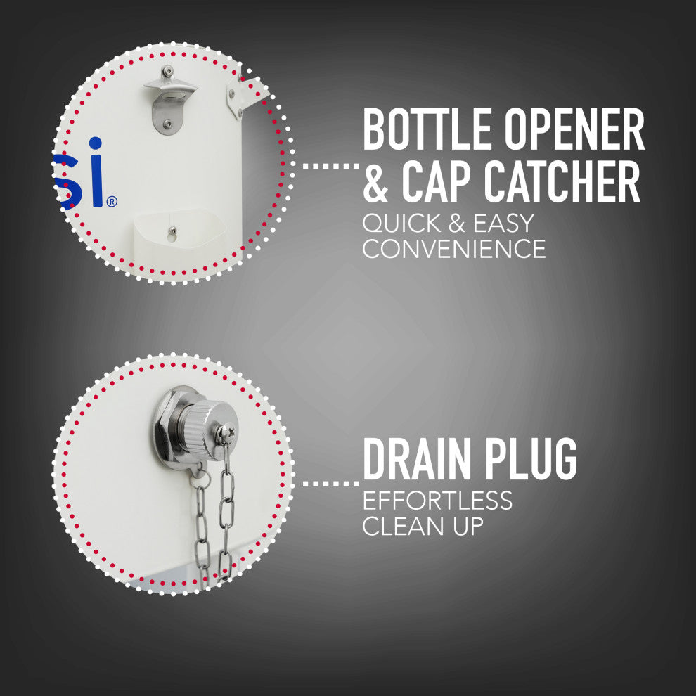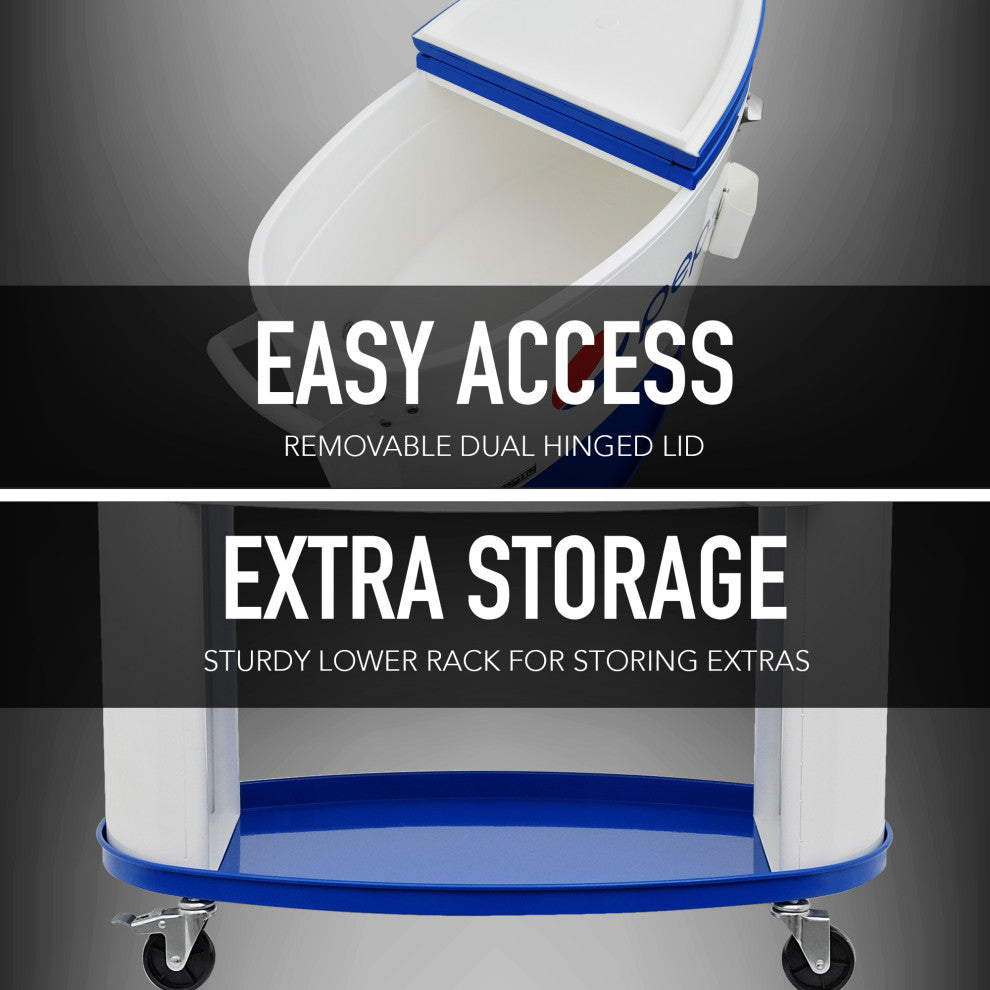 This 80 quart outdoor White Pepsi oval sporty style cooler cart will add elegance to any backyard & outdoor patio. Entertain your guests with this beautiful powder coated steel rolling patio cooler cart with its insulated basin that keeps your beverages cold for up to 36 hours with its injected molded insulation technology. It holds up to 110 "“ 12oz cans with plenty of room for ice. Featuring a powder coated finish for long life & split double lid for easy access to cold drinks. Once you have your preferred drink, you can easily remove the cap with the convenient bottle opener & cap catcher. This patio cooler includes four heavy-duty casters for easy mobility, Two locking for stability once in the desired area. Easily roll this patio cooler to any desired location wherever the party goes. After use, simply pull the plug & drain. The convenient lower rack/shelf provides extra space for extra beverages or other items you wish to store. Feel confident in this Permasteel patio cooler as a solution for all of your patio cooler needs. • Two side handles make for an easy move anywhere on the patio; four casters with two that lock make it easy to stabilize in the desired area• Easy to open dual-hinged lids allows for quick drink access; lid is removable; includes bottle opener and cap catcher on the side, drain plug makes cleanup quick and easy• Hold up to 110 "“ 12-ounce cans with extra room for ice; sturdy lower rack for extra storage of additional drinks• Quality UV resistant long lasting durable powder coated finish; weatherproof/rust resistant• Simple cleaning with removal of drain plug