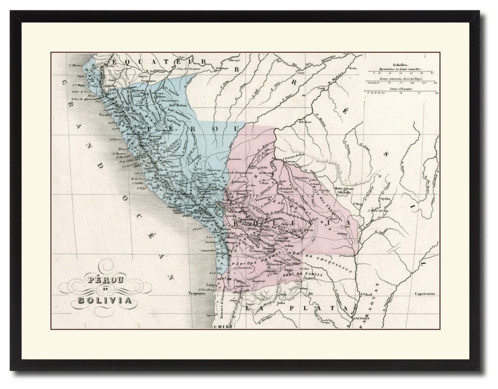 Peru, Bolivia Vintage Map Print On Canvas With Picture Frame 28" X 37"