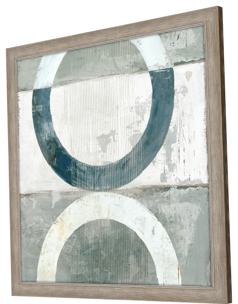 Blue and white circles converge with a hand applied enhanced gel finish. Framed in a distressed silver finish moulding.