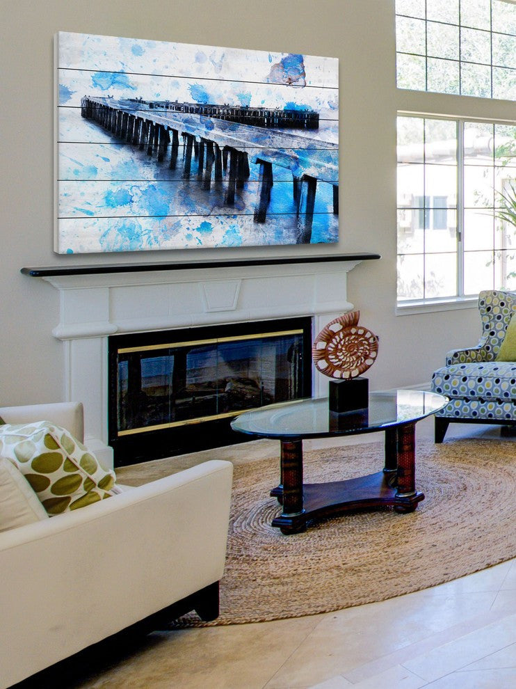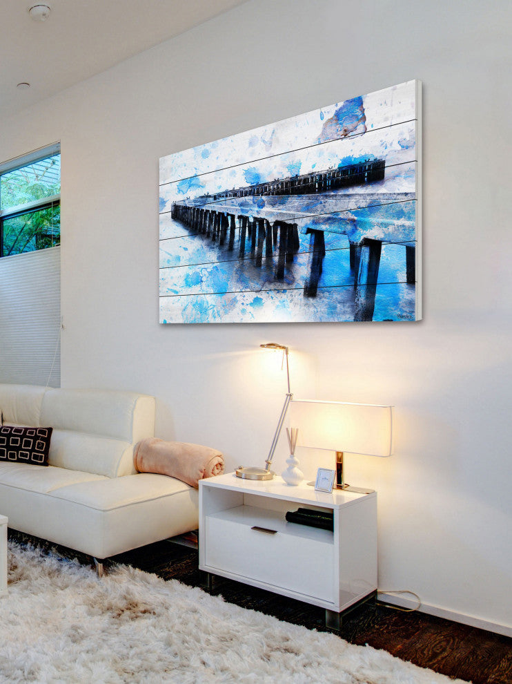 Striking and unique, the "Pier" Print on White Wood by Parvez Taj will bring your walls to life. Printed on white wood, this 45 inch wide by 30 inch tall beach style artwork will make a statement in any living room, dining room, or bedroom.- Fine art UV ink print on white wood by Parvez Taj- wood pieces are hand-selected by Fine craftsmen for printing- Arrives ready to hang- Includes a certificate of authenticity- Artist signature on the front