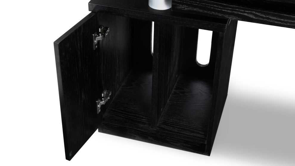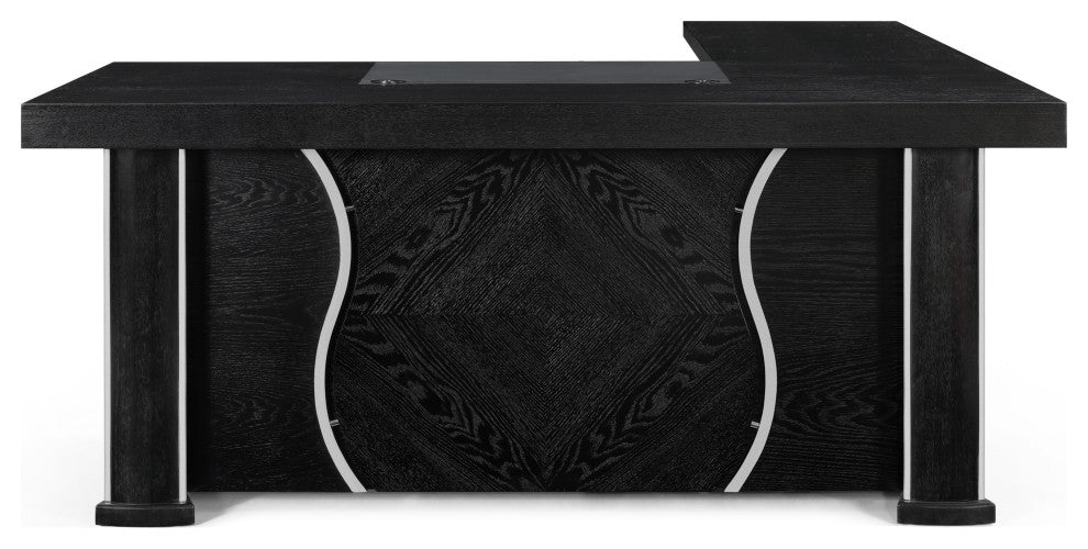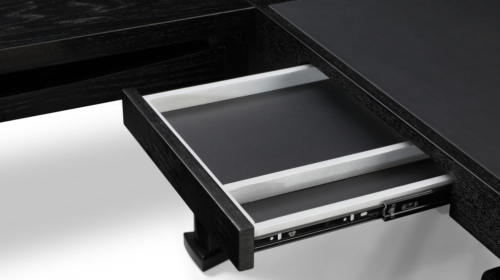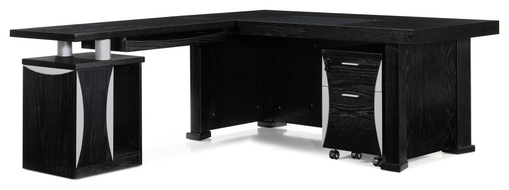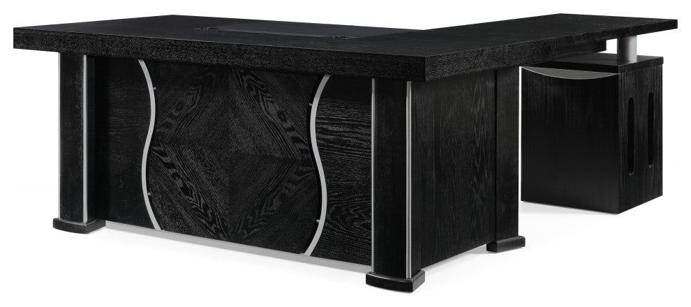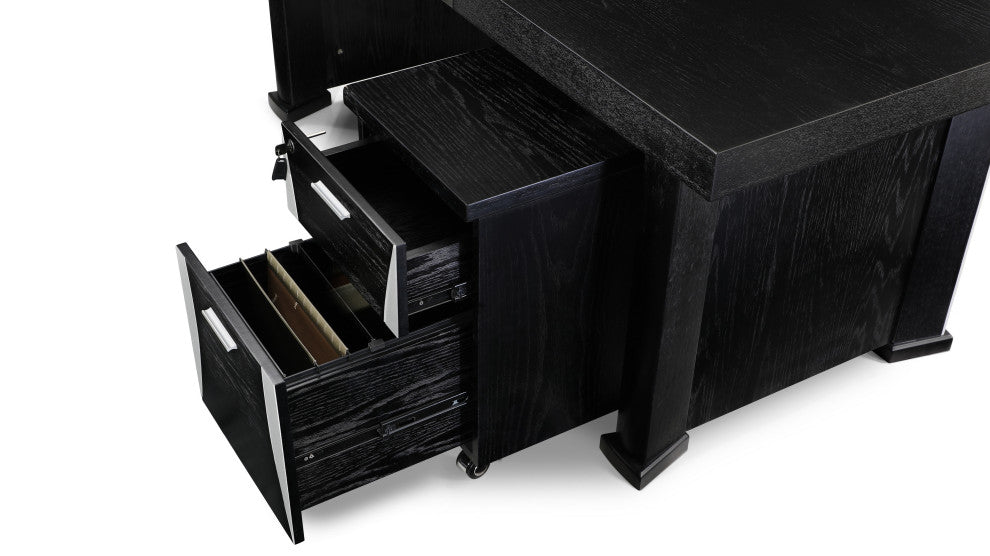 Make a statement and feel like a boss with the Pierce executive desk. With a three-inch desktop, black stained American oak finish, and silver accent details, style will exude from your office. The Pierce desk also includes a small sliding pencil drawer inside the desktop, a faux leather writing pad, and two portholes for monitor and phone cables. The return features a 20.5" keyboard tray and CPU storage. As an added bonus, the Pierce ships with a matching rolling locking filing cabinet with 2 storage drawers for ultimate flexibility in setup.• Writing Pad Width: 28" • Desktop Thickness: 3" • Keyboard Tray Width: 20.5"• Keyboard Tray Depth: 9"