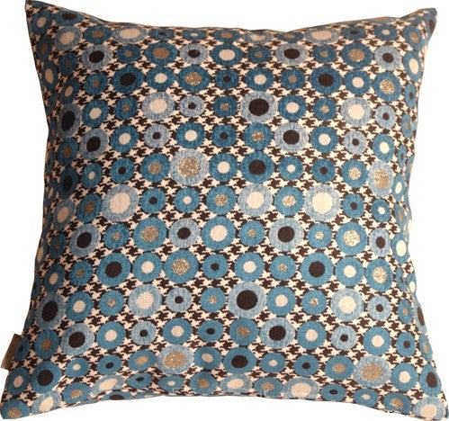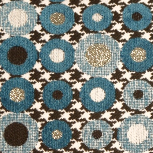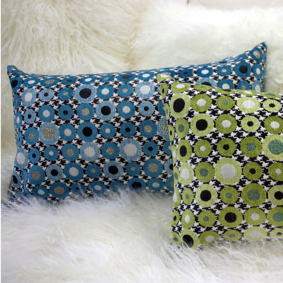 This fun throw pillow features circles in shades overlaid upon a classic black and white houndstooth pattern background. The circles are soft chenille and the centers are in sparkling metallic. This lively accent pillow combines beautifully with its plain black and white houndstooth partner.