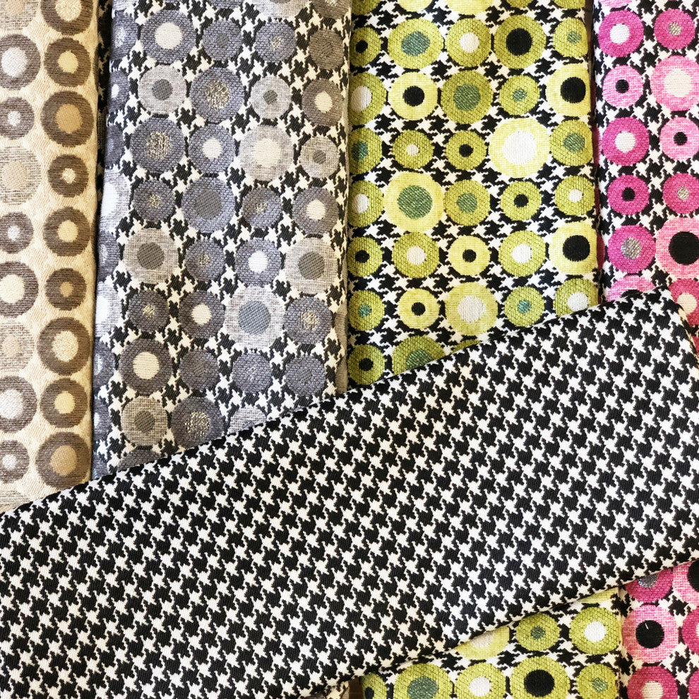 This fun throw pillow features circles in shades overlaid upon a classic black and white houndstooth pattern background. The circles are soft chenille and the centers are in sparkling metallic. This lively accent pillow combines beautifully with its plain black and white houndstooth partner.