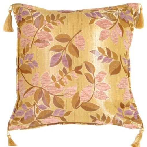 With a background fabric in neutral colors and interesting textures, this pillow has the added beauty of chenille leaves in lilac and soft rose. The variety of neutral tones range from soft yellow golds to beige, taupe and soft cinnamon. The corners are emphasized by tassels in soft silky gold. Versatile botanical prints are always popular!Features:-17" x 17" square pillow-70% Cotton, 30% Acrylic fabric content-Same fabric, front and back-Knife edge seams-Pale gold tassels on corners-Color matched zipper closure-Machine wash cold or dry clean-Filling: Polyester Fiber Fill • Pillow dimensions always refer to the pillow cover''s width and length while lying flat unstuffed and are rounded up to the nearest whole inch.