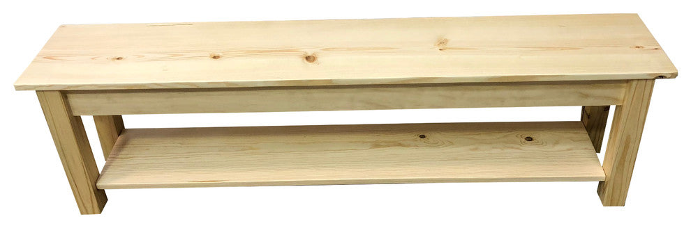 The Pine Storage bench has a shelf for extra storage. The classic color means that this bench will go with anything. It would make a great shoe rack bench for a foyer or mud room. The bench is sealed with three coats of a polyurethane finish that repels water and protects the wood. Dimensions:12" Deep x 17" tall (multiple lengths available just choose from the drop down).SHIPPINGWe want you to enjoy your new bench as soon as possible. We custom craft each of our benches and they generally ship within 15-20 business days right to your front door.100% SOLID WOOD, HAND CRAFTEDNo particle board or cheap assembly practices here. We craft and assemble each one by hand and finish each with a hand-applied multi-step durable satin polyurethane finish. After ensuring that everything fits and looks just right we pack it for shipping.Grain / Color Notice Because our furniture is crafted from solid real wood there will be variation in color, and grain pattern. Products in the images have been crafted from the same species of wood and stained with the exact same stain color as the product you will receive. However because wood is a natural product no two pieces are the same. Depending on an individual piece of wood and grain pattern the stain may take more or less resulting in the color variation. While every effort has been made to supply you with the most accurate photographic representation, you should expect some variation in your product.