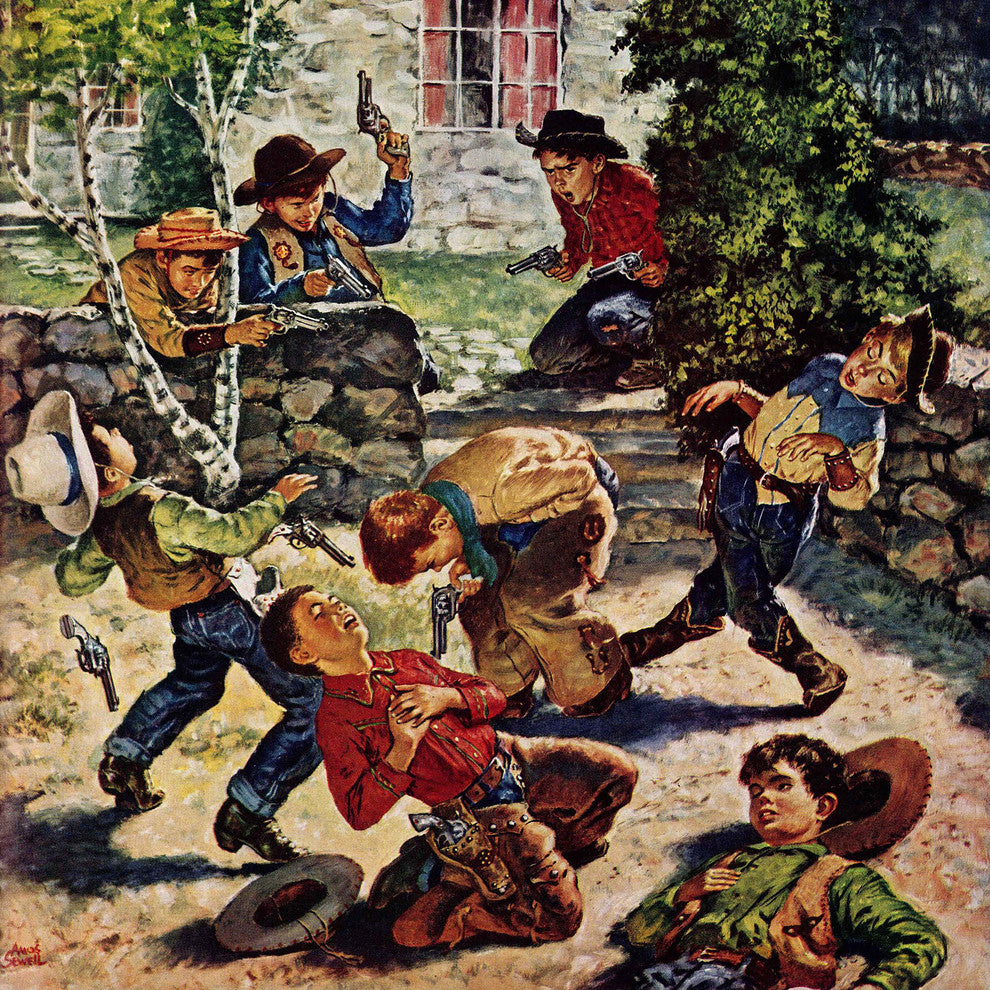 "Playing Cowboy" Painting Print on Canvas by Amos Sewell features vivid tones and supple artistry. Printed on canvas, this 32 inch wide by 32 inch tall piece will be an exceptional addition to any room. Fine art canvas print from the Marmont Hill Art Collective Professionally hand stretched Gallery wrapped in sustainable, non-warping wood Arrives ready to hang Made in the USA Includes a certificate of authenticity