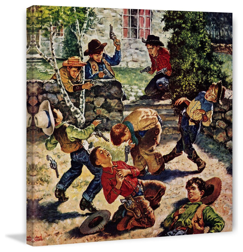 "Playing Cowboy" Painting Print on Canvas by Amos Sewell features vivid tones and supple artistry. Printed on canvas, this 40 inch wide by 40 inch tall piece will be an exceptional addition to any room. Fine art canvas print from the Marmont Hill Art Collective Professionally hand stretched Gallery wrapped in sustainable, non-warping wood Arrives ready to hang Made in the USA Includes a certificate of authenticity
