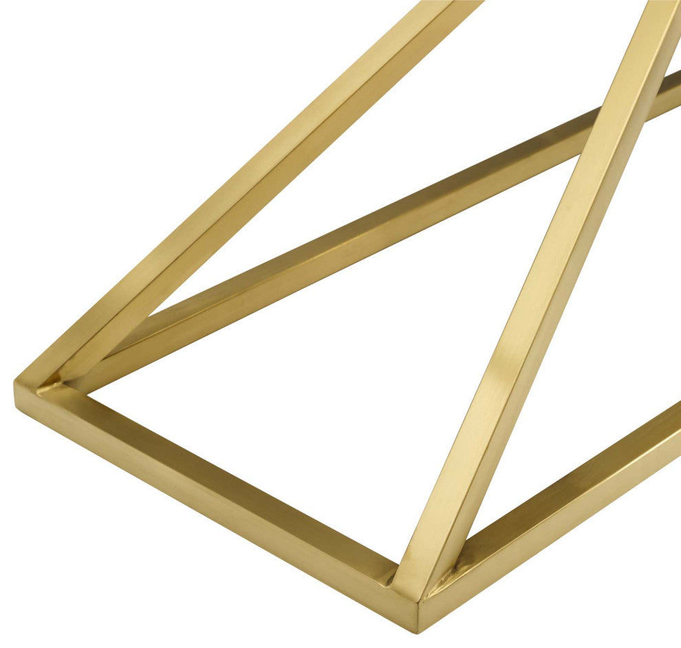 Elevate your home decor with the geometric design of Point. A glamorous console table with vintage appeal, Point features two intersecting pyramid-shaped brushed gold stainless steel metal tubing for a piece of uninterrupted visual depth and sophistication. Complete with a tempered glass square top, this eye-catching accent table is a perfect addition to the living room, entryway, hallway, or foyer. A striking console table for a table lamp, picture frames, and other household items, Point comes with foot caps to help protect flooring and arrives fully assembled.Set Includes:One - Point 59" Brushed Gold Metal Console Table