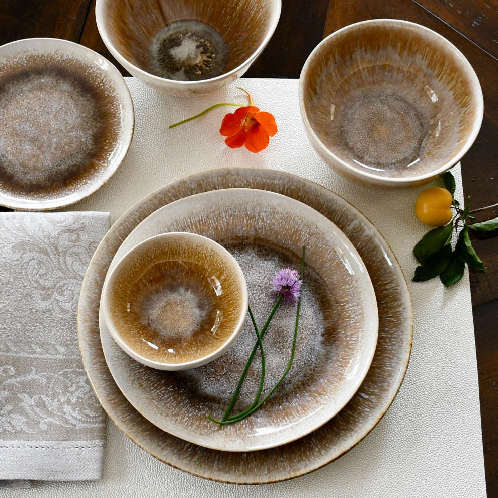 The Point Lobos collection brings stylish appeal to everyday dining. Different shades of brown mix with the white background in endless combinations. The reactive glaze makes each piece unique. Use this plate for a small salad or to accompany a meal. 6 1/2" diameter. Durable stoneware is microwave and dishwasher safe. Made in Portugal exclusively for Carmel Ceramica.
