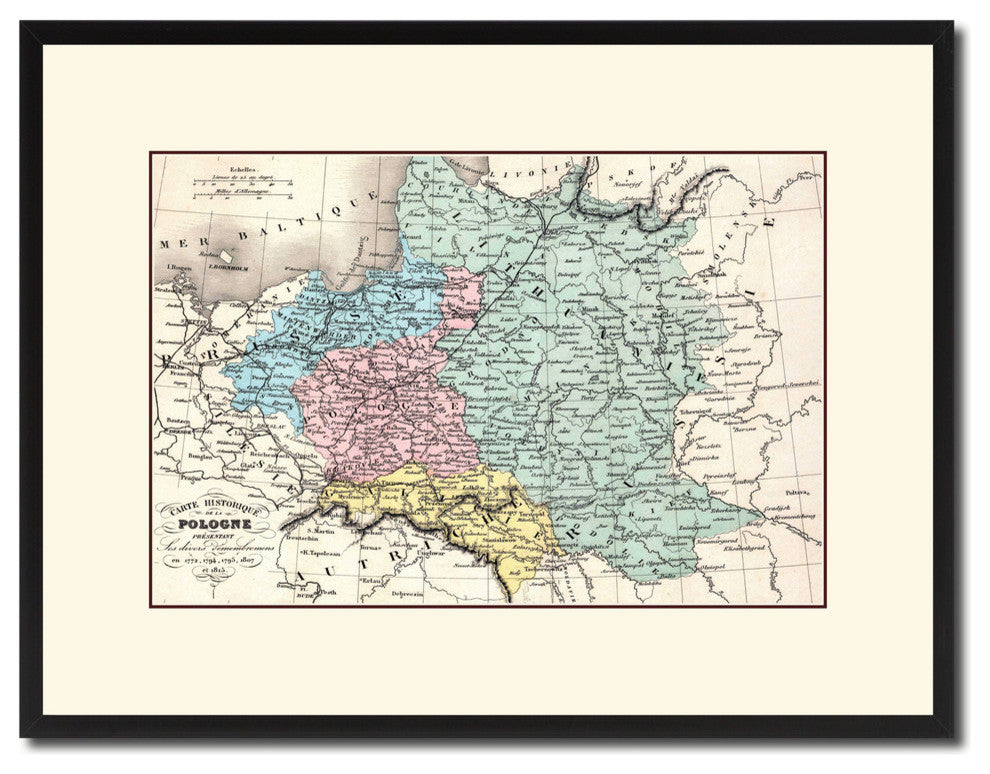 Poland, Prussia, Germany Vintage Map Print On Canvas With Picture Frame 16" X 21