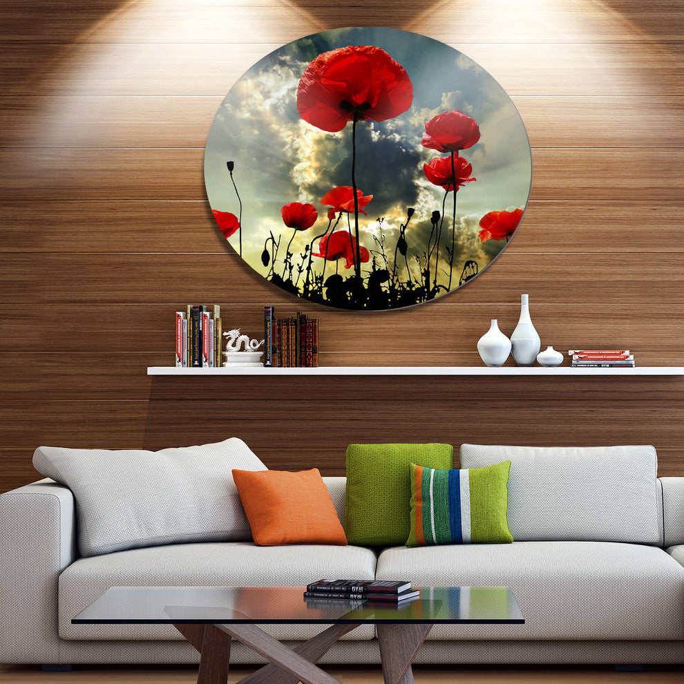 Bring Contemporary Abstraction to your home with this large Circle Metal wall art. This Poppies on Thunderstorm Background Metal Artwork makes it the focal point of any room or office.