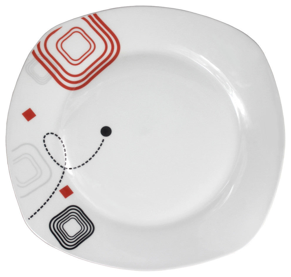 20 Piece Porcelain Square Dinnerware Set, service for 4. This elegant and stylish set is made of durable porcelain. Set includes 4-10.5" dinner plate, 4-9" Soup bowl, 4-8" Salad plate, 4-6 ounce coffee cup and 4-saucers. Fun designs for entertaining and dining. Dishwasher and Microwave Safe.
