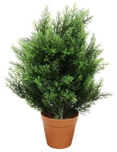 Realistic cypress plant features two-tone green leaves320 leavesComes in a weighted potRecommended for indoor use - if using outdoors place under a covered areaDimensions: 21" high (from the base of the pot to the top of the tree) x 14" base diameter (widest point when fully fluffed)Pot Dimensions: 4.5" high x 5" diameterMaterial(s): PE/plastic/cement