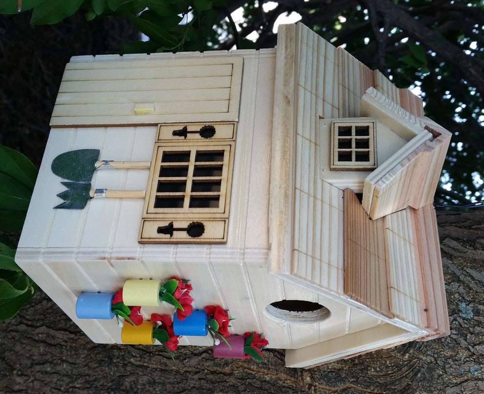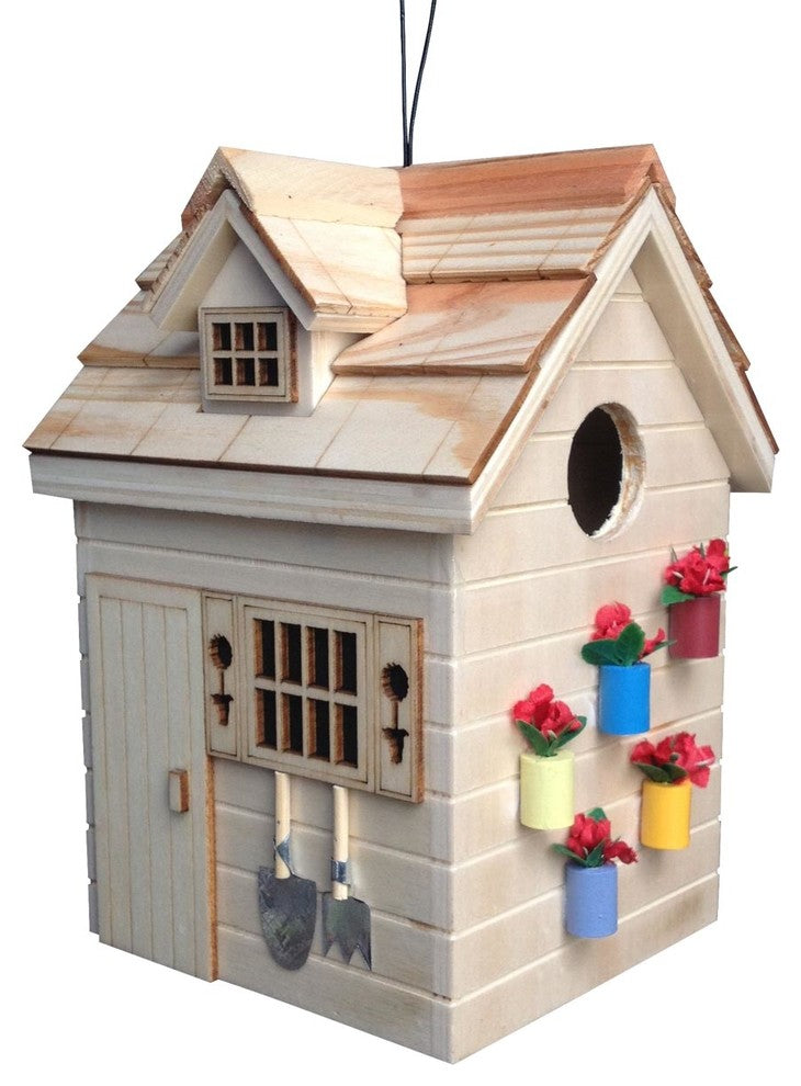 The potting shed is the heart of the garden and now the perfect bird sanctuary! This adorable potting shed in a natural finish is really a birdhouse and the future home for Wrens, Finches, Chickadees and Nuthatches, Decorated on one side with tiny potted plants, the back features a handsome garden trellis. Two charming topiary cutouts adorn the shutters while garden tools hang beneath the window frame. The house has a 1 ¼"� opening, a removable back wall, drainage, ventilation and is topped by pine shingles. A flexible wire hangar makes for easy installation. Item Dimensions: 5.75 in L x 5.75 in W x 7.75 in H