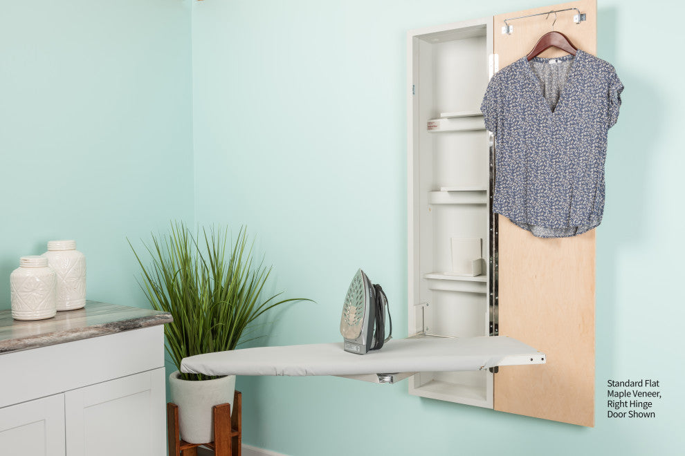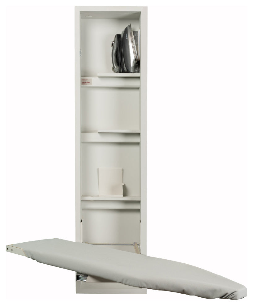 The premium length board coupled with the adjustable swivel creates the overall maximum flexibility and a 4-inch height adjustment lets you choose the most comfortable ironing board height. When finished ironing, you can store the iron while it''s hot. The oversized iron storage compartment will hold the majority of irons being sold today. The Hot Iron Rest is the perfect spot to rest a warm iron and prevent scorching when adjustment garments for continued ironing. The ANE-46 includes the adjustable swivel, but is nonelectrical with a 46" ironing board requiring a nearby outlet to plug in your iron.Features:-Spring activated 46 inch ventilated metal ironing board with 90 degree left or right swivel and 4 inch height adjustment-Premium sized hot iron storage-Extra Storage Shelves and Garment Bar-Industrial Strength Ironing Board Cover and Pad-Cool Grey Interior, Unfinished Exterior, Raised Panel White Door-Raised Panel White Door-Recess or Surface Mount-UL Listed