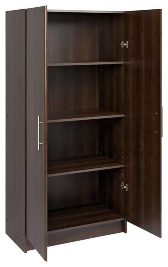 Sophisticated and functional, the 32" Elite Storage Cabinet has 1 fixed and 2 adjustable shelves to store and organize all your personal items. Add a modern touch to any living space or existing décor with the rich espresso laminate finish. This multipurpose cabinet is the perfect addition to any kitchen, entryway, laundry room or anywhere else you may need extra storage space. Use alone or pair with the 32" Espresso Stackable Wall Cabinet for a complete storage solution.Features: • Smooth laminate finish in rich espresso compliments any existing décor • Doors feature high quality, European-style 6-way adjustable hinges that mount to open left or right • Solid MDF doors complete with a sleek, profiled edge • Durable, solid handles in classic brushed nickel • 16" Deep, adjustable shelves provide plenty of storage space • Ships Ready to Assemble • Includes an instruction booklet for easy assembly • 5-year manufacturer''s limited warranty on parts • Constructed from CARB-compliant, laminated composite woods with a sturdy MDF backer • Proudly manufactured in CanadaSpecifications: • Product Dimensions: 65" H x 32" W x 16" D • Weight Capacity: 20 lbs per shelf