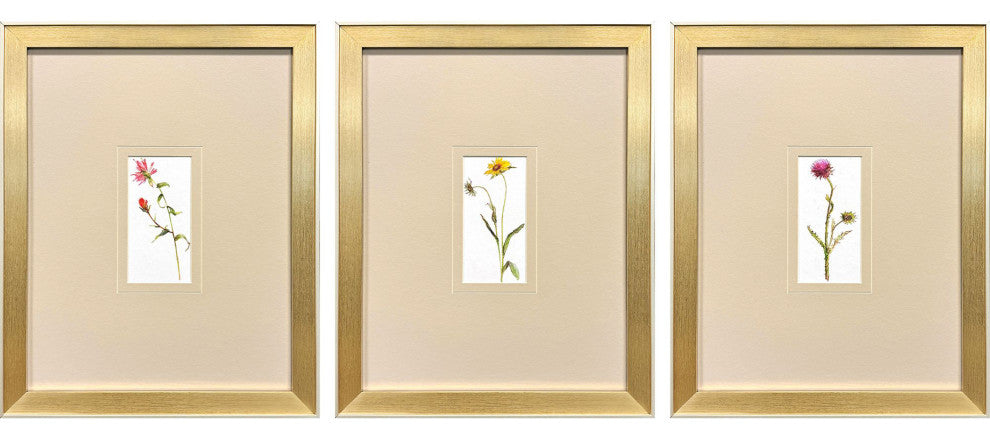 A series of delicate floral stem prints are matted in corn starch. Framed in a modern gold finish molding with champagne side and lip.