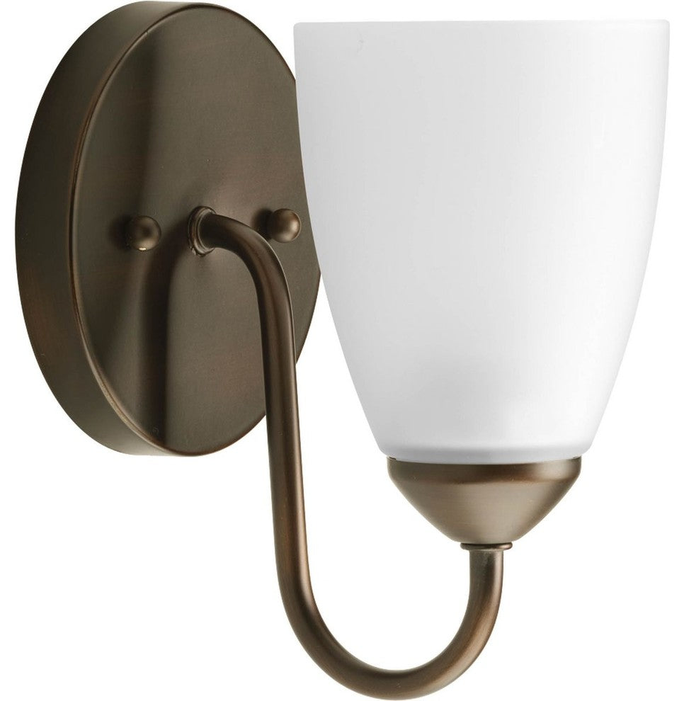 Gather possesses a smart simplicity to complement today''s home. This one-light bath bracket contains an etched glass shade which adds distinction and provide pleasing illumination to your room. Featuring a beautiful Antique Bronze finished frame, this collection allows you to decorate an entire home with confidence and style.Finish: Antique BronzeBulb Type: Uses Medium BaseBulb Wattage: 100Bulb Quantity: 1Listed: Damp location listedMount Type: WallStyle: Contemporary/SoftFeatures: Antique Bronze finishEtched glass shadesDistinctive lightingCoordinate with other Gather fixturesRoom Type: Bathroom Lighting and/or Hall & Foyer LightingDimensions: Width/Diameter:5"Height:7-1/2"Specifications:Mounting:Wall mountedMounting strap for outlet box includedMounts in up or down positionBack plate covers a standard 4 hexagonal recessed outlet box5 dia.Electrical:Threaded socket ring secures glassPre-wired6 of wire supplied120VLamping:Quantity: 1100W Medium BaseMedium ceramic socketAdditional Information:UL-CUL Damp location listed1 year warrantyCompanion Bath and Vanity, Ceiling Fans,Chandelier, Closeto-ceiling, Hall and Foyer, Pendant, Wall bracket, fixtures are available