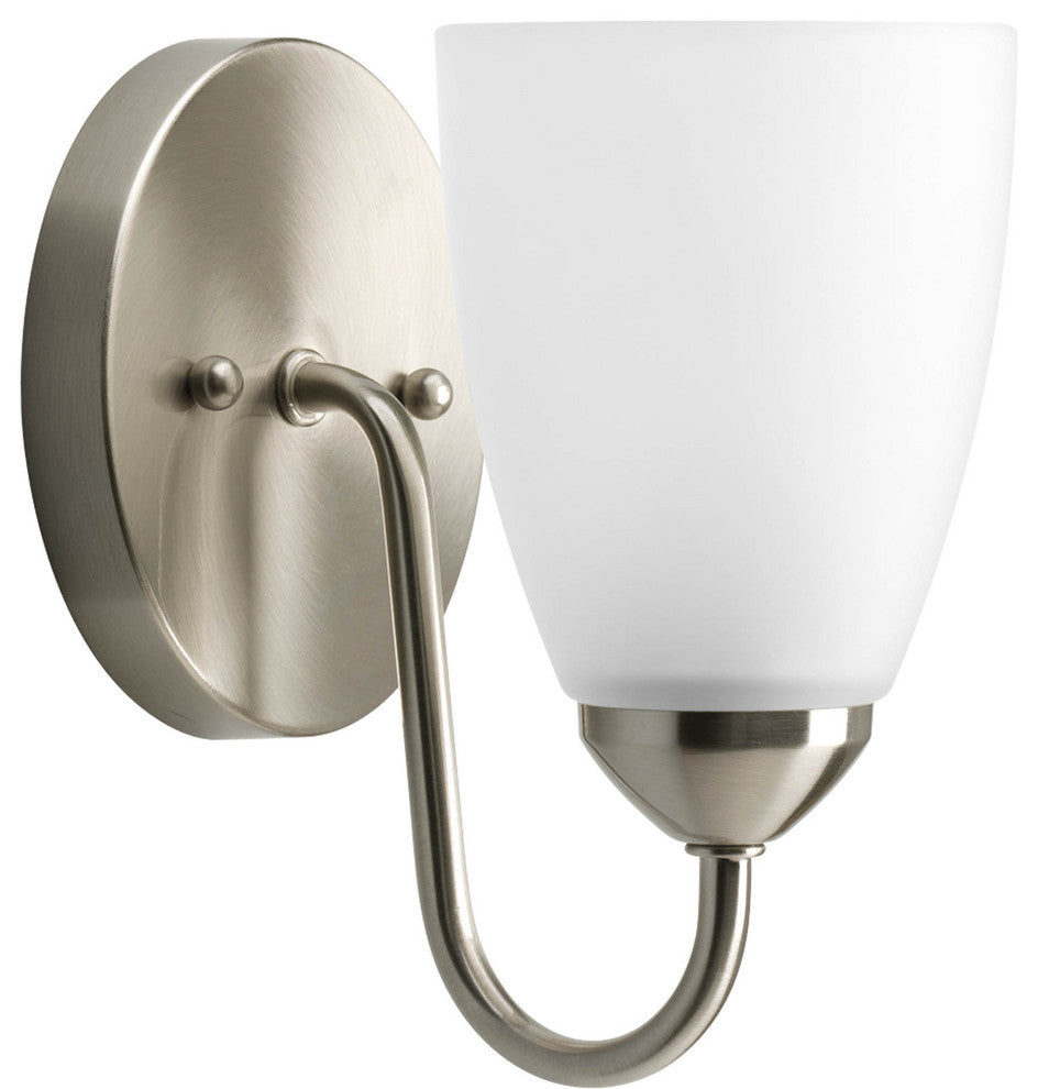 Gather possesses a smart simplicity to complement today''s home. This one-light bath bracket contains an etched glass shade which adds distinction and provide pleasing illumination to your room. Featuring a glamorous Brushed Nickel finished frame, this collection allows you to decorate an entire home with confidence and styleFinish: Brushed NickelBulb Type: Uses Medium BaseBulb Wattage: 100Bulb Quantity: 1Listed: Damp location listedMount Type: WallStyle: Contemporary/SoftFeatures: Brushed Nickel finishEtched glass shadesDistinctive lightingCoordinate with other Gather fixturesRoom Type: Bathroom Lighting and/or Hall & Foyer LightingDimensions: Width/Diameter: 5"Height: 7-1/2"Specifications:Mounting:Wall mountedMounting strap for outlet box includedMounts in up or down positionBack plate covers a standard 4 hexagonal recessed outlet box5 dia.Electrical:Threaded socket ring secures glassPre-wired6 of wire supplied120VLamping:Quantity: 1100W Medium BaseMedium ceramic socketAdditional Information:UL-CUL Damp location listed1 year warrantyCompanion Bath and Vanity, Ceiling Fans,Chandelier, Closeto-ceiling, Hall and Foyer, Pendant, Wall bracket, fixtures are available