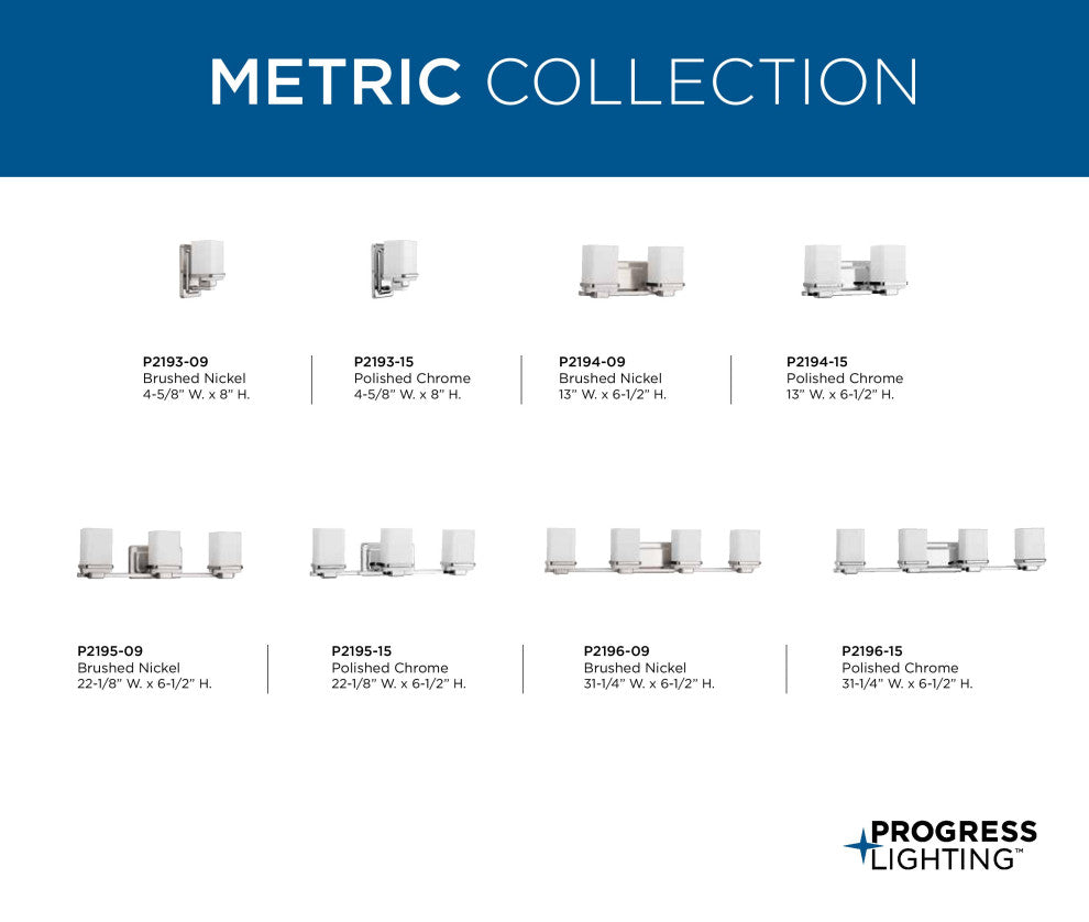 Enjoy a cool and sleek modern design with the two-light bath & vanity in the Metric Collection. A simple, etched opal glass shade nestles inside a die-cast frame that is finished in Polished Chrome providing light above and below the fixture.