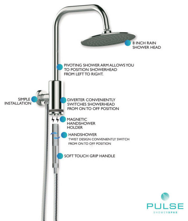 The Aquarius Shower System from Pulse Shower Spas replaces your existing showerhead with an oversized rain showerhead and multi-function hand shower. The integrated dual-function diverter allows you to use each function independently. Typical install is less than 1 hour-even for the do it yourselfer. It simply connects to the water supply at your existing showerhead location and uses your existing hot/cold shower valve.Surface mounted and completely pre-plumbed, easily retrofit your existing shower without a remodel8" Rain showerhead with soft tips to clear mineral buildup for long lasting performanceInvigorating hand shower with 59" double-interlocking stainless steel hoseConvenient on/off function on handheld and showerheadMagnetic handheld holder1/2" NPT Brass nipple connectorFlow Rate: 2.5 GPM/9.5 LPM17.5"H x 2"W x 14"DColor and Finish: ChromeMaterials: BrassDominant Material: BrassValve Included: NoCUPC approved Unit: YesShower Arm Reach: 17"Showerhead Width: 8"Showerhead Shape: RoundShowerhead Functions: Single FunctionShowerhead Spray Pattern: RainShowerhead Material: BrassHand Shower: Single FunctionHand shower Number of Functions: 1Hand shower Spray Functions: MassageHand shower Head Diameter: 1"Hand shower Head Material: MetalHand Shower Hose Length: 59"/150cmHand Shower Wall Mount: NoSlide Bar Included: No