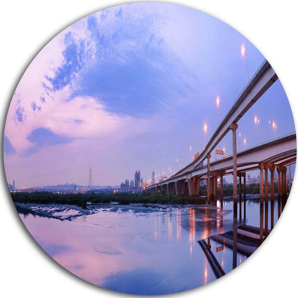 Bring Contemporary Abstraction to your home with this large Circle Metal wall art. This Purple Beach with Pier Metal Artwork makes it the focal point of any room or office.