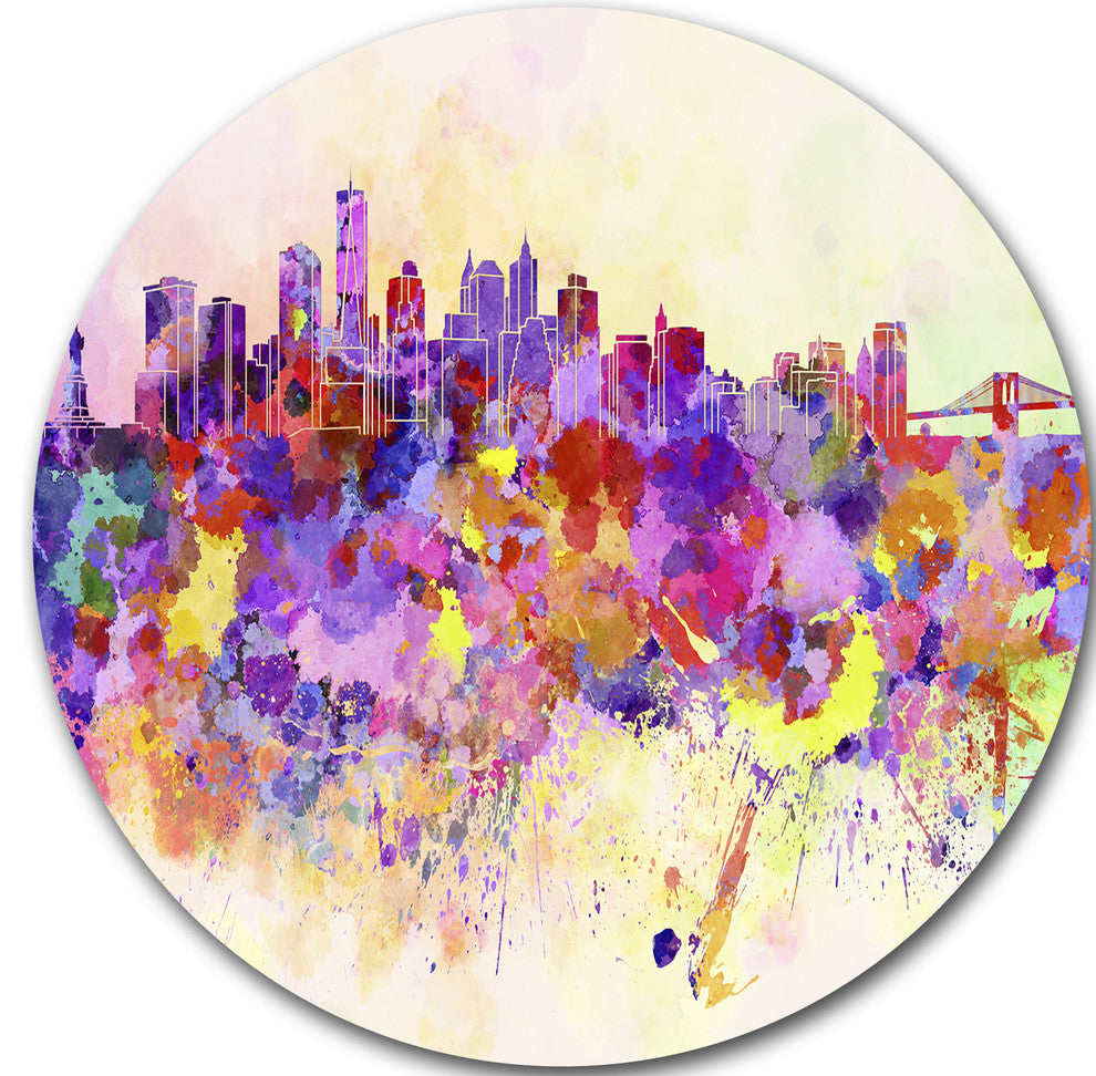 Purple New York Skyline, Cityscape Disc Metal Artwork, 36"