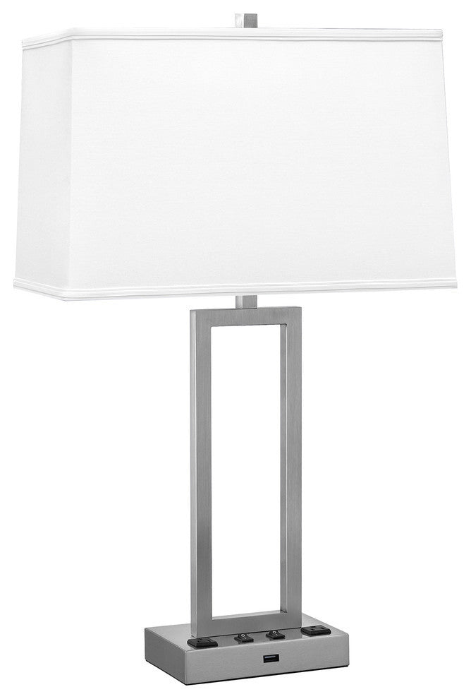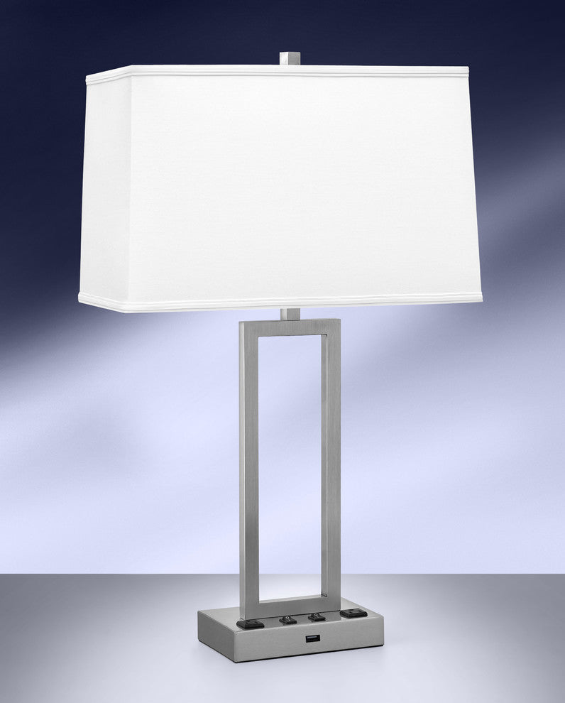 Standard Lamp Specifications for #UWL2915:Product Type: Twin-light Double Nightstand LampHeight: 29"Finish: Brushed SteelConstruction: SteelSocket: (2) Aluminum On/Off Med. Base Type A 60W Max socket(s). (Bulb not included)Switching: (2) On/Off Rocker switch(es) located on the base.Cord: 6''5'' (from base) long black 16 gauge cord set with a 3 prong grounded plug.Electrical Outlet: (2) 3 prong grounded outlet(s).Data Port: None.USB Port: (1) 10W/2A USB port(s).UL/CUL and/or ETL listed: YesHarp Size: 7.5 inches (including the saddle)Standard Packing: 2 per carton (shade packed separately).Lamps & Shades per SKU: 1Lamping: (2) Aluminum On/Off Med. Base Type A 60W Max socket(s).Shade Size and Description: White fabric laminated to rectangular styrene hardback drum with self fold trim measuring 10"/16" x 11"/17" x 10.5" w/ .5" drop w/flatted washer (Top x Bottom x Slant).Bulb Included: NoMaterial Description: constructed from polished, plated, and lacquered steel.