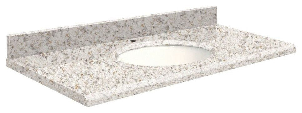 Transolid engineered quartz is produced from 93% quartz under extreme high pressures to yield a top that is hard, stain and heat resistant with a consistent color throughout. Transolid quartz tops never need sealing, polishing or reconditioning and are practically care-free. They are exceptionally hard, making them resistant to cracks, chips, scratches and stains for years of trouble-free beauty. All include an undermount oval china bowl and 4-in loose backsplash.