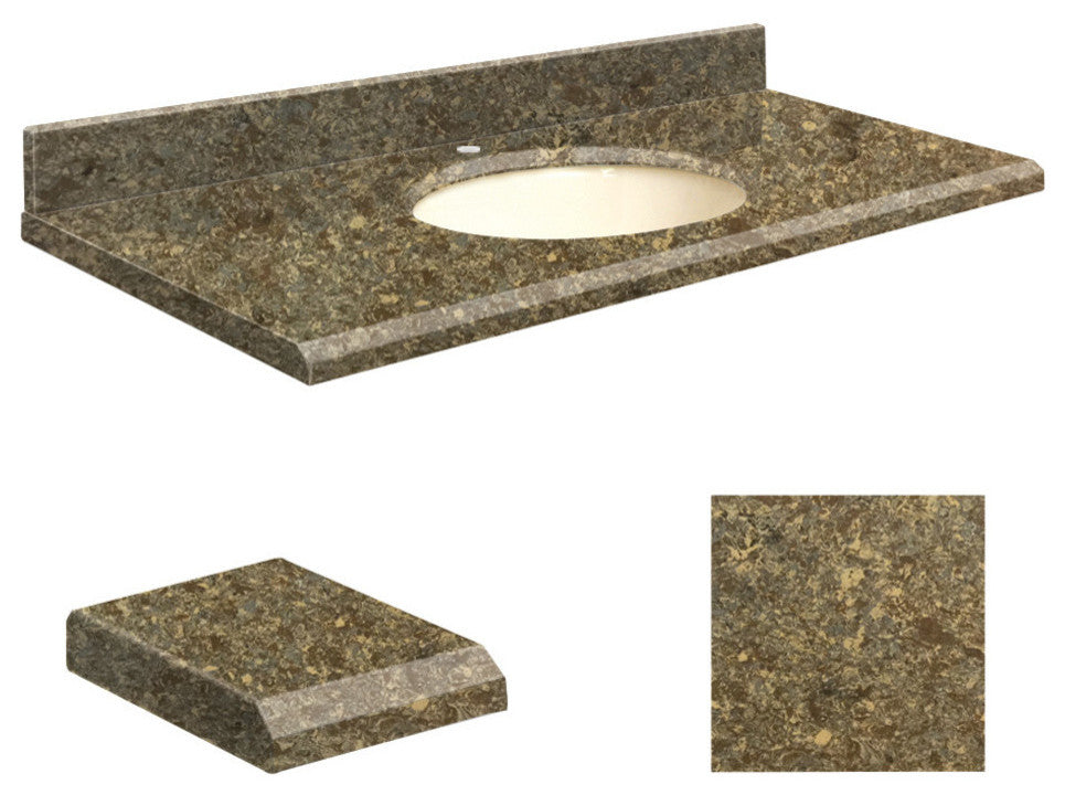 Transolid engineered quartz is produced from 93% quartz under extreme high pressures to yield a top that is hard, stain and heat resistant with a consistent color throughout. Transolid quartz tops never need sealing, polishing or reconditioning and are practically care-free. They are exceptionally hard, making them resistant to cracks, chips, scratches and stains for years of trouble-free beauty. All include an undermount oval china bowl and 4-in loose backsplash.