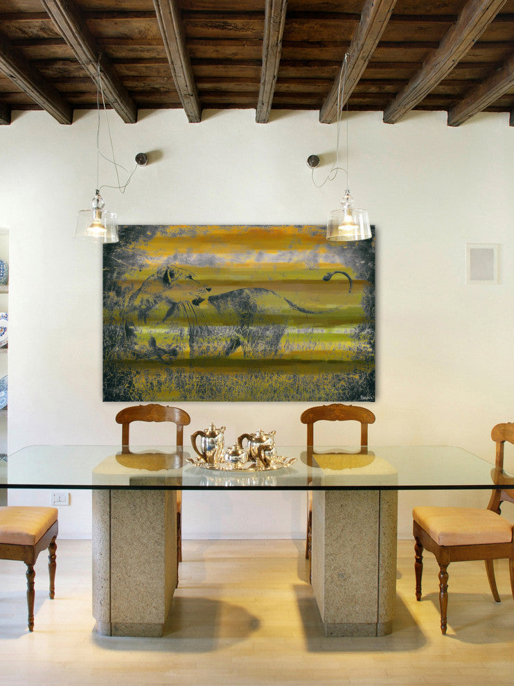Striking and unique, the "Queen of the Jungle" Print on Canvas by Parvez Taj will bring your walls to life. Printed on canvas, this 60 inch wide by 40 inch tall contemporary artwork will make a statement in any living room, dining room, or bedroom.- Fine art canvas print by Parvez Taj- Professionally hand stretched- Gallery wrapped in sustainable, non-warping wood- Arrives ready to hang- Made in the USA- Includes a certificate of authenticity- Artist signature on the front