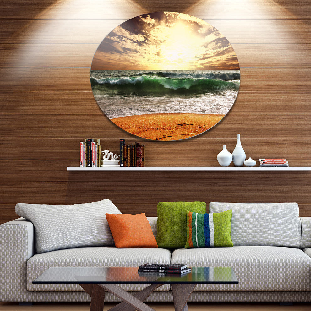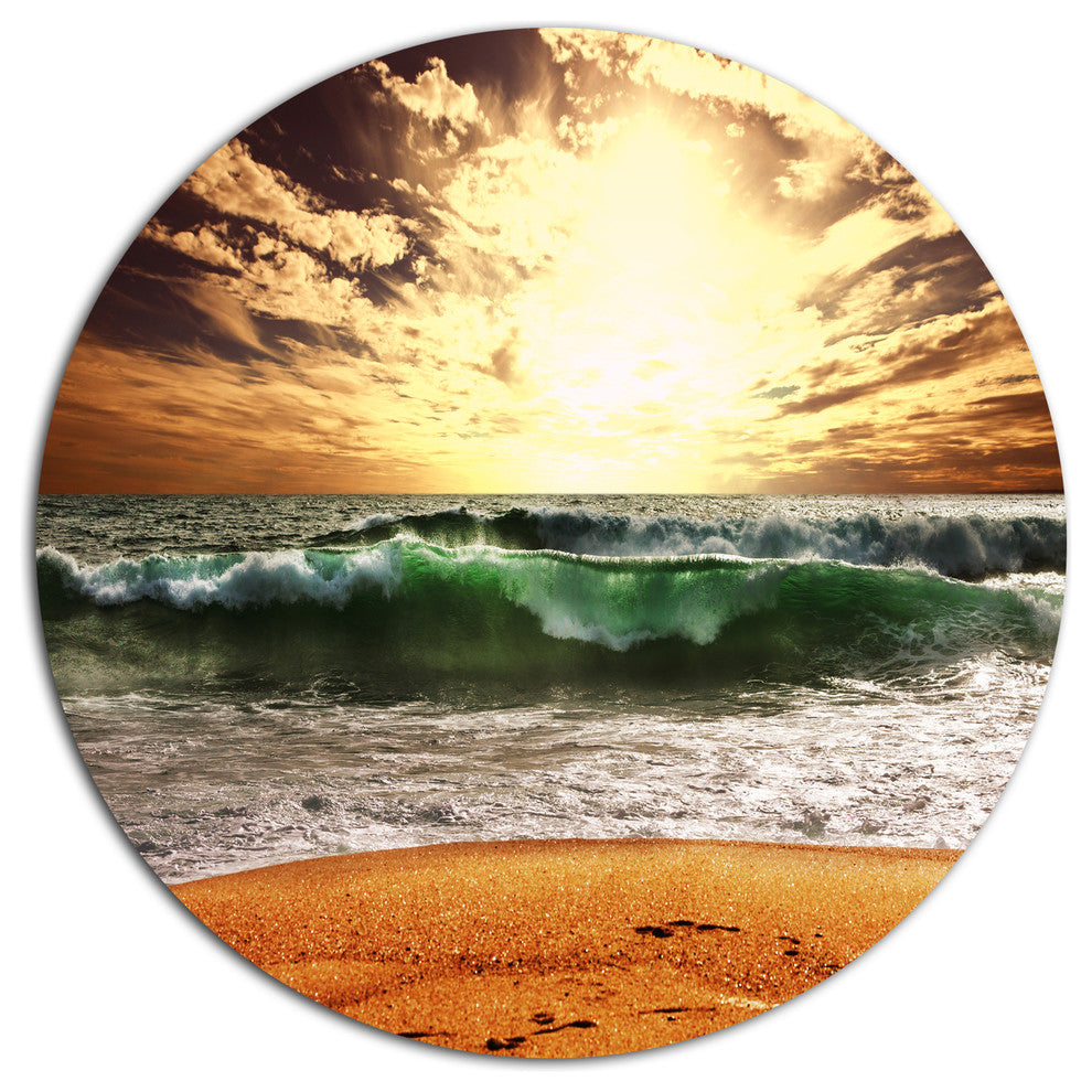 Raging Green Waves At Sunset, Seashore Disc Metal Artwork, 23"