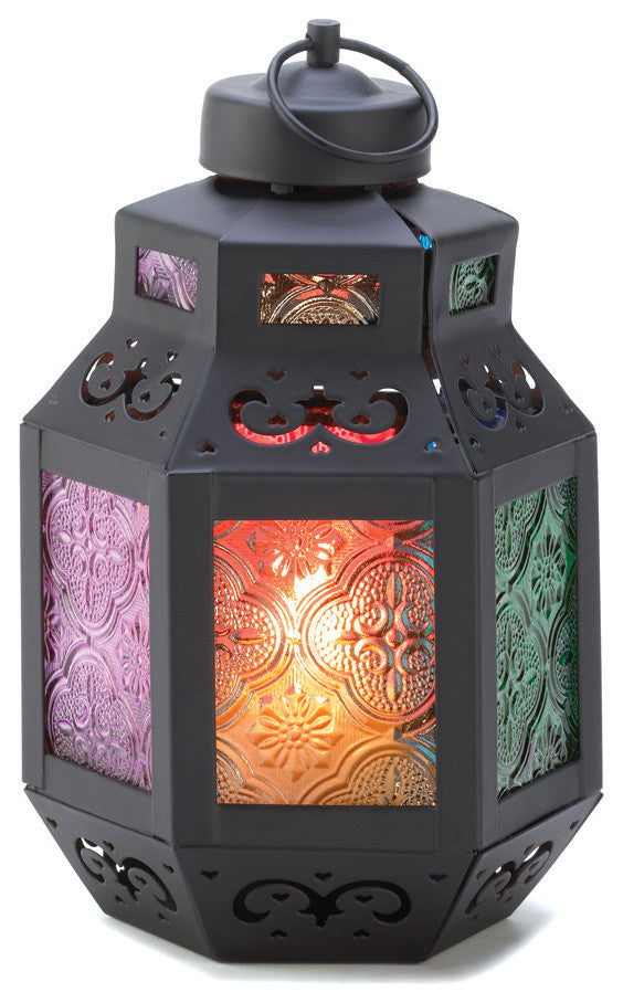 Small in size but big on style, this Moroccan marketplace lantern sparkles your surroundings with a blaze of color! Six separate color glass panels create a dazzling candlelit display.